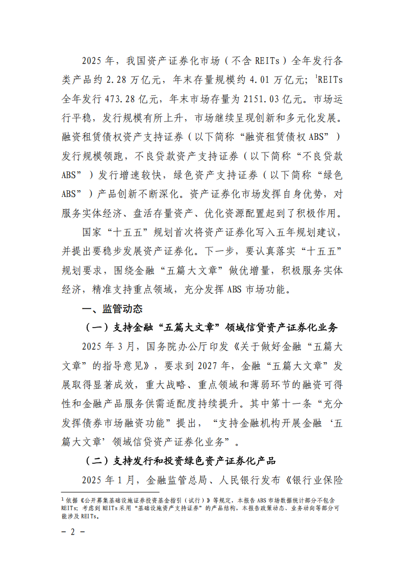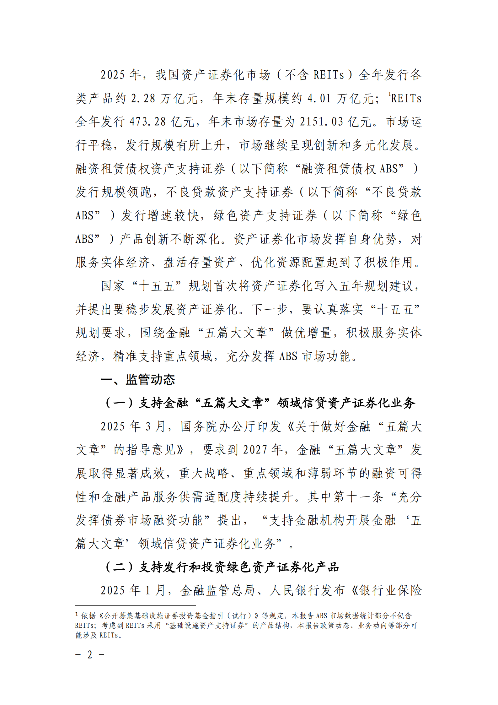 2025年,我国资产证券化市场(不含REITs)全年发行各类产品约2.28万亿元,年末存量规模约4.01万亿元;REITs全年发行473.28亿元,年末市场存量为2151.03亿元。市场运行平稳,发行规模有所上升,市场继续呈现创新和多元化发展。融资租赁债权资产支持证券(以下简称“融资租赁债权ABS”)发行规模领跑,不良贷款资产支持证券(以下简称“不良贷款ABS”)发行增速较快,绿色资产支持证券(以下简称“绿色ABS”)产品创新不断深化。资产证券化市场发挥自身优势,对服务实体经济、盘活存量资产、优化资源配置起到了积极作用。