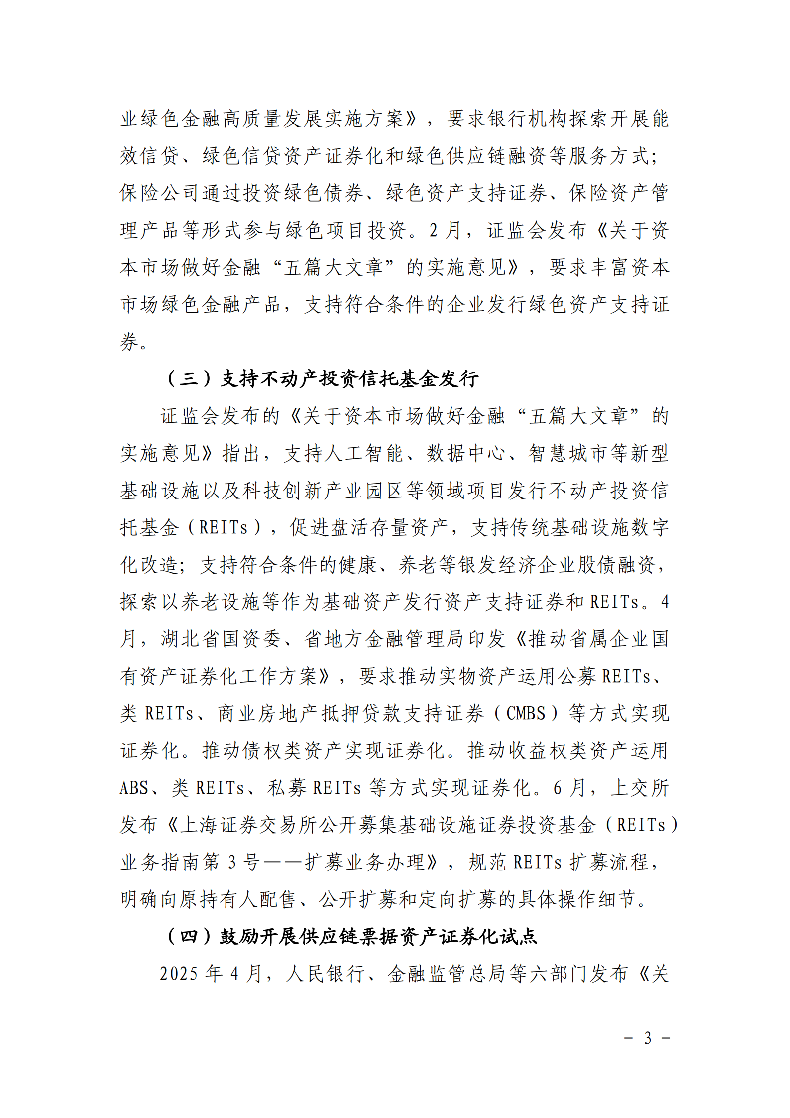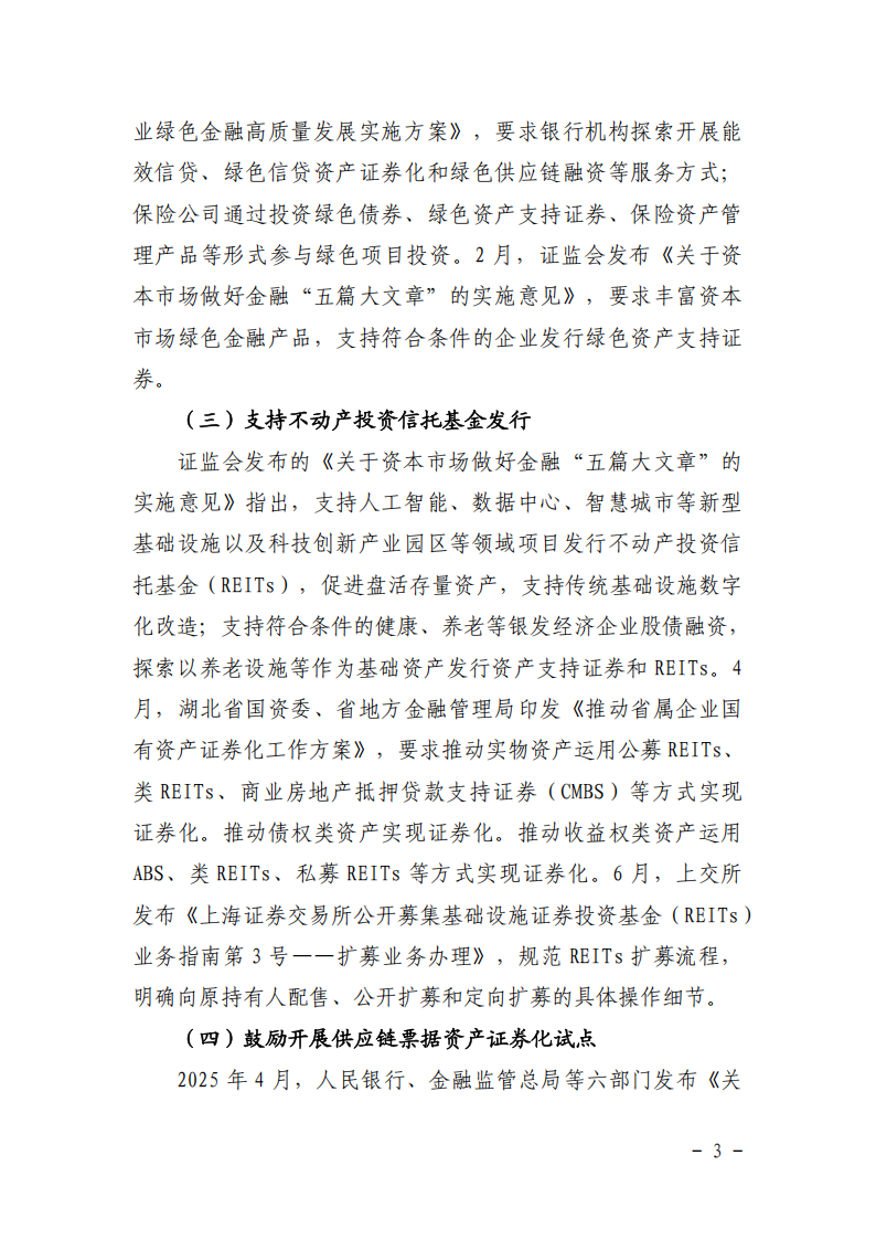 证监会发布的《关于资本市场做好金融“五篇大文章”的实施意见》指出,支持人工智能、数据中心、智慧城市等新型基础设施以及科技创新产业园区等领域项目发行不动产投资信托基金(REITs),促进盘活存量资产,支持传统基础设施数字化改造;支持符合条件的健康、养老等银发经济企业股债融资,探索以养老设施等作为基础资产发行资产支持证券和REITs。4月,湖北省国资委、省地方金融管理局印发《推动省属企业国有资产证券化工作方案》,要求推动实物资产运用公募REITs、类REITs、商业房地产抵押贷款支持证券(CMBS)等方式实现证券化。推动债权类资产实现证券化。推动收益权类资产运用ABS、类REITs、私募REITs等方式实现证券化。6月,上交所发布《上海证券交易所公开募集基础设施证券投资基金(REITs)业务指南第3号——扩募业务办理》,规范REITs扩募流程,明确向原持有人配售、公开扩募和定向扩募的具体操作细节。