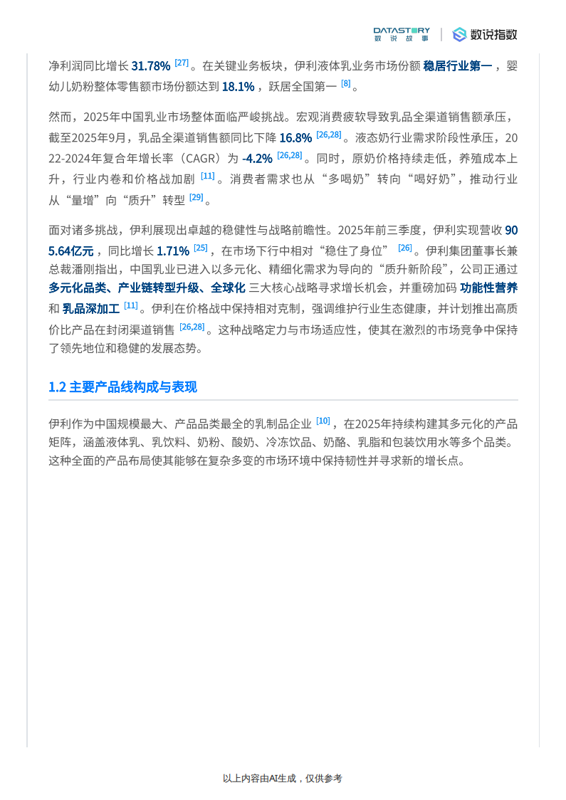 面对诸多挑战,伊利展现出卓越的稳健性与战略前瞻性。2025年前三季度,伊利实现营收905.64亿元,同比增长1.71%[25],在市场下行中相对“稳住了身位”[26]。伊利集团董事长兼总裁潘刚指出,中国乳业已进入以多元化、精细化需求为导向的“质升新阶段”,公司正通过多元化品类、产业链转型升级、全球化三大核心战略寻求增长机会,并重磅加码功能性营养和乳品深加工[11]。伊利在价格战中保持相对克制,强调维护行业生态健康,并计划推出高质价比产品在封闭渠道销售[26,28]。这种战略定力与市场适应性,使其在激烈的市场竞争中保持了领先地位和稳健的发展态势。