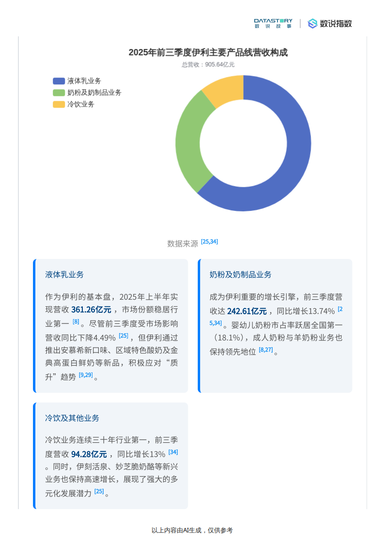 伊利作为中国规模最大、产品品类最全的乳制品企业[10],在2025年持续构建其多元化的产品矩阵,涵盖液体乳、乳饮料、奶粉、酸奶、冷冻饮品、奶酪、乳脂和包装饮用水等多个品类。这种全面的产品布局使其能够在复杂多变的市场环境中保持韧性并寻求新的增长点。