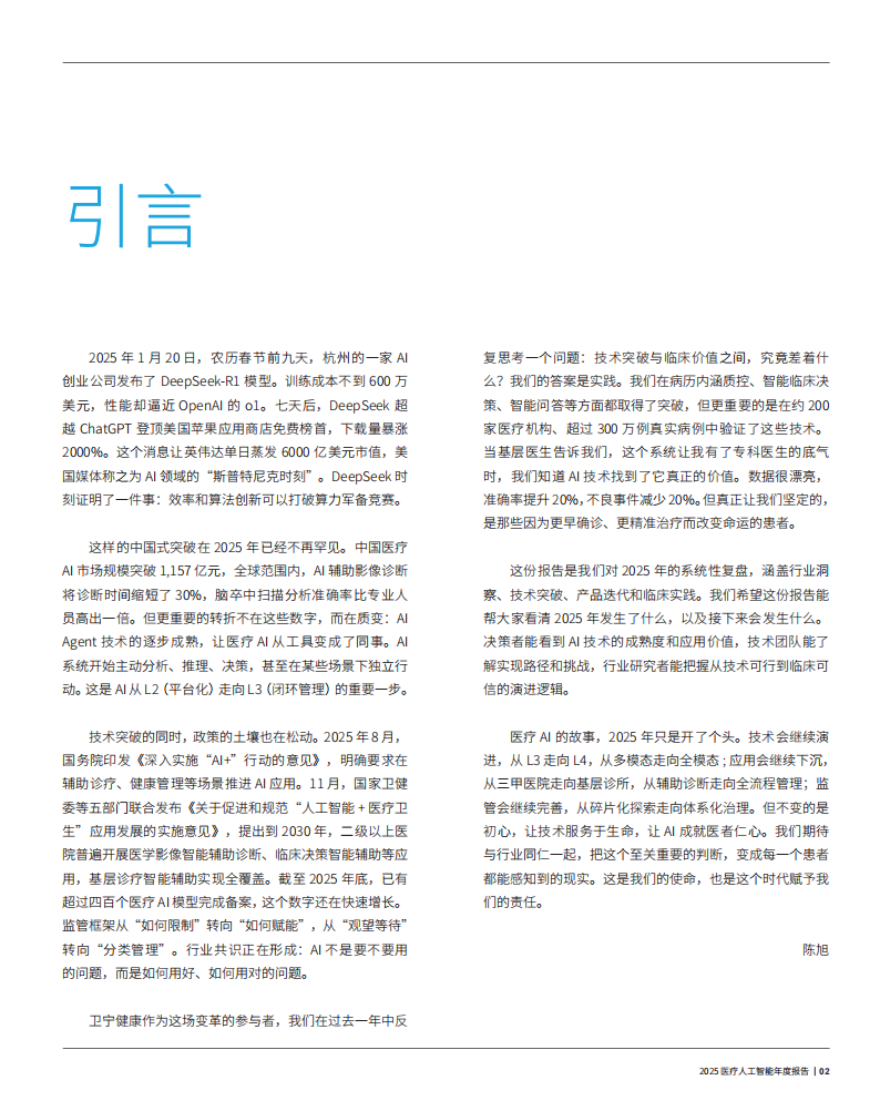 这份报告是我们对2025年的系统性复盘,涵盖行业洞察、技术突破、产品迭代和临床实践。我们希望这份报告能帮大家看清2025年发生了什么,以及接下来会发生什么。决策者能看到AI技术的成熟度和应用价值,技术团队能了解实现路径和挑战,行业研究者能把握从技术可行到临床可信的演进逻辑。