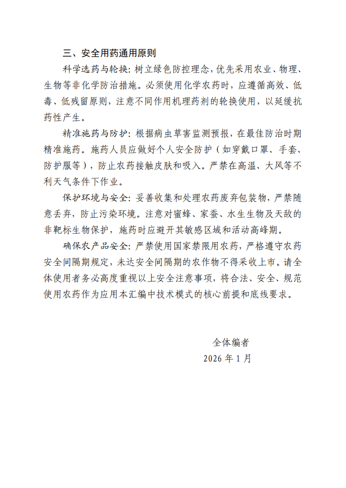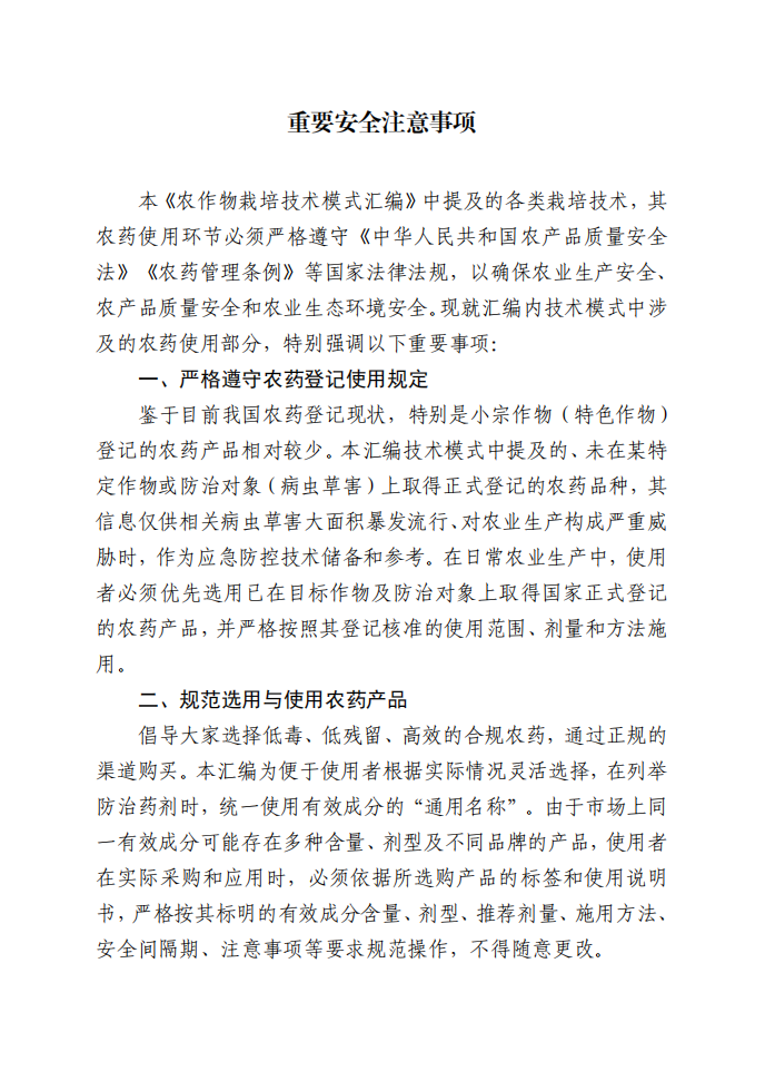 确保农产品安全:严禁使用国家禁限用农药,严格遵守农药安全间隔期规定,未达安全间隔期的农作物不得采收上市。请全体使用者务必高度重视以上安全注意事项,将合法、安全、规范使用农药作为应用本汇编中技术模式的核心前提和底线要求。