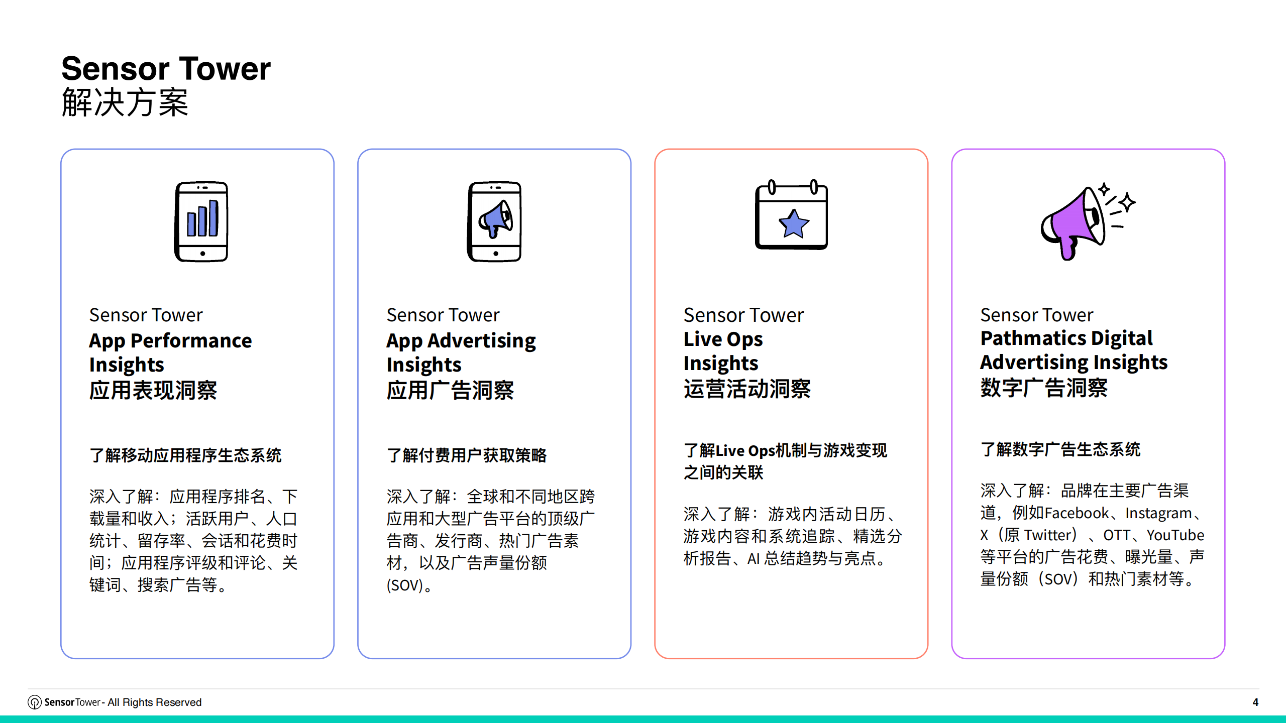 自2013年成立以来,Sensor Tower的移动应用洞察助力营销专家、应用开发者及游戏制作者透过使用情况、参与度及付费获取策略,洞悉移动应用生态的奥秘。时至今日,我们的数字市场洞察平台已涵盖受众、零售媒体及Pathmatics数字广告洞察,让品牌与广告公司能够全方位掌握其在网络、社交及移动平台上的竞品广告策略与目标受众。