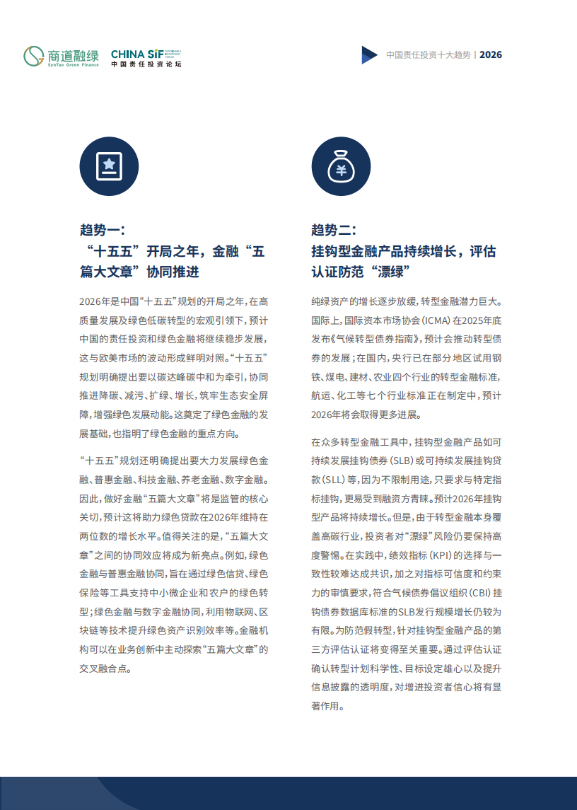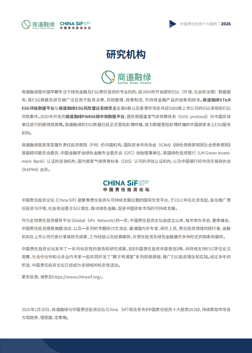 2025年1月20日,商道融绿与中国责任投资论坛(China SIF)联合发布《中国责任投资十大趋势2026》,持续帮助市场各方观趋势、理思路、定策略。