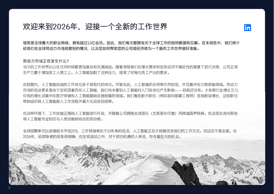 全球招聘率仍比疫情前水平低20%工作转换率处于10年来的低点,人工智能正在大规模改变我们的工作方式。但这还不是全部。在2026年,给领导者的信息很明确:在宏观波动之中,对于抓住机遇的人来说,存在着巨大的机会。