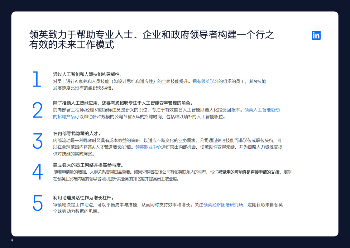 领英是全球最大的职业网络,拥有超过13亿会员。因此,我们每天都拥有关于全球工作的独特数据和见解。在本报告中,我们将介绍我们在全球劳动力市场观察到的情况,以及您如何帮助您的公司或经济体为一个新的工作世界做好准备。