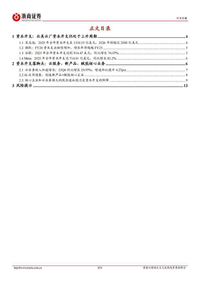 1、AI产业持续提振云业务景气度,北美云厂云业务收入加速增长:25Q4美三大云厂商(Google、微软、亚马逊)云业务营收达到8861.5亿美元,同比增长29.97%,高于彭博一致预期4.97%;同比增速环比提升4.27pct。