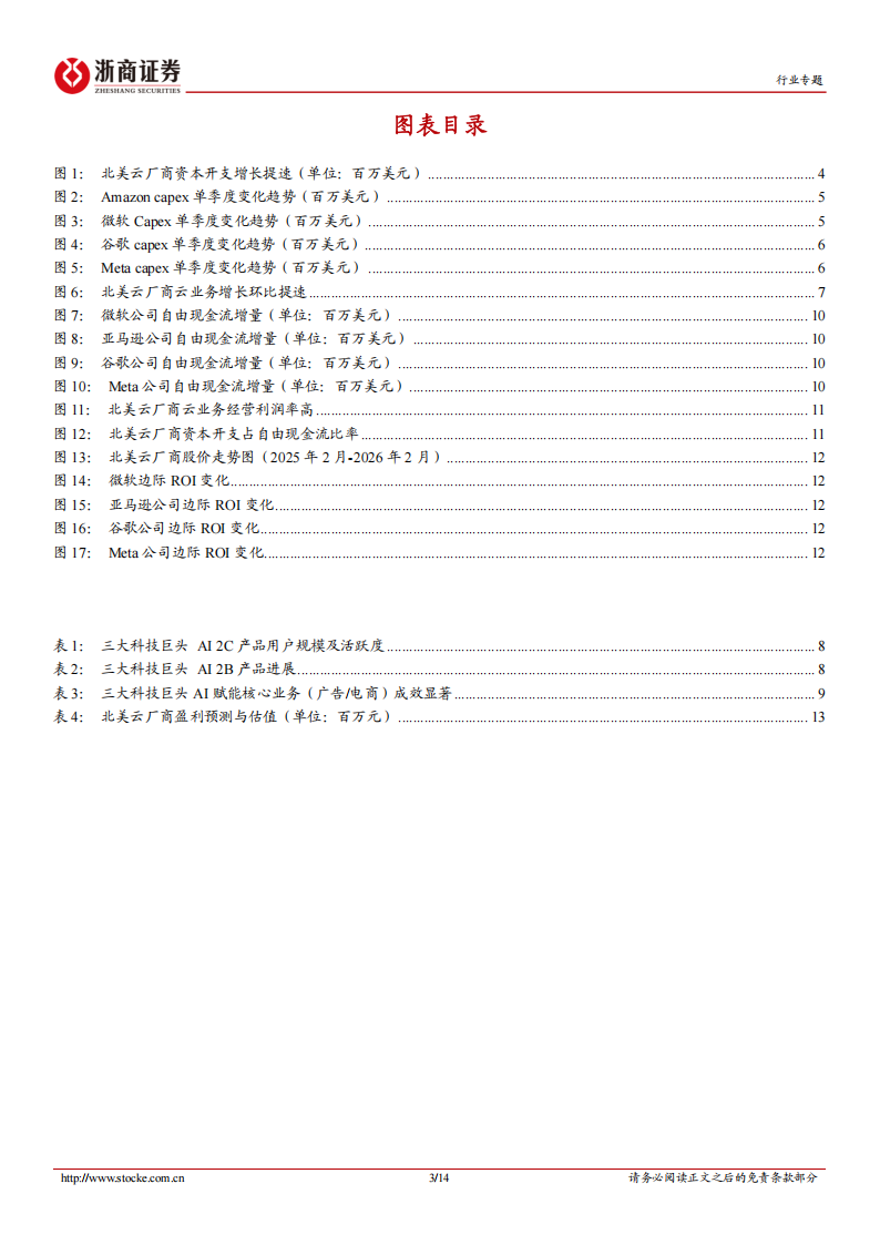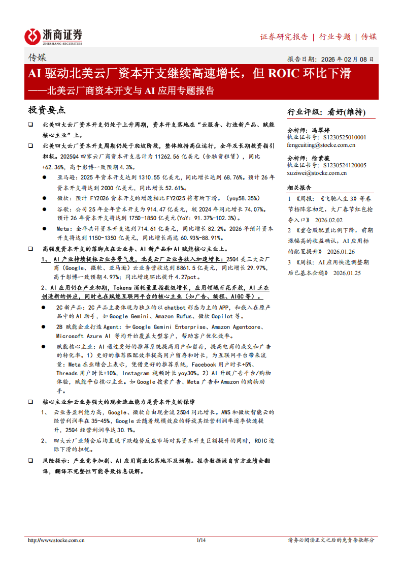 1、云业务盈利能力高,Google、微软自由现金流25Q4同比增长。AWS和微软智能云的经营利润率在35-45%,Google云随着规模效应的释放其经营利润率逐季快速提升,25Q4经营利润率达30.1%。