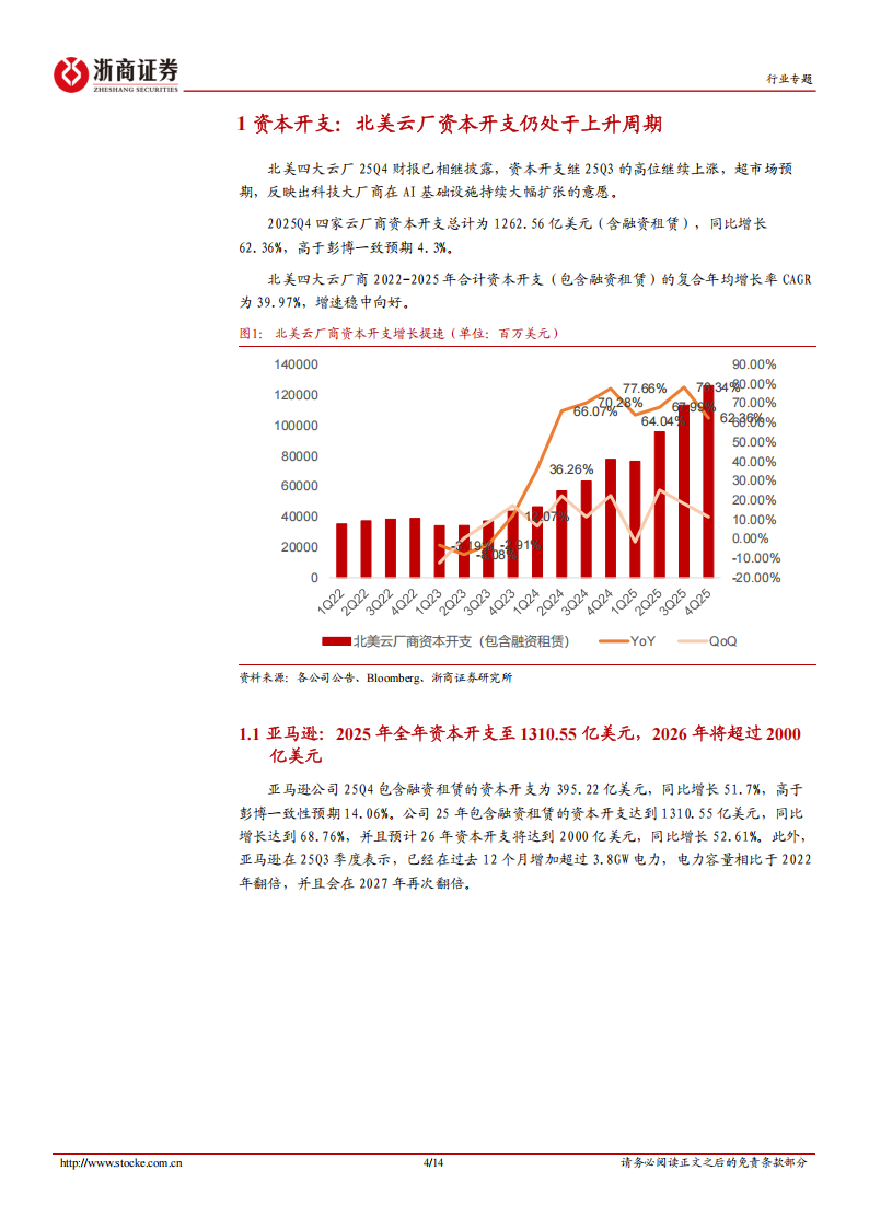 北美四大云厂25Q4财报已相继披露,资本开支继25Q3的高位继续上涨,超市场预期,反映出科技大厂商在AI基础设施持续大幅扩张的意愿。