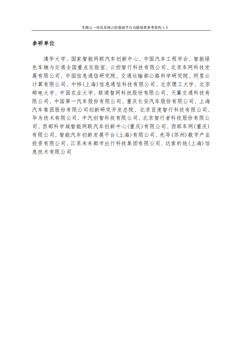 清华大学、国家智能网联汽车创新中心、中国汽车工程学会、智能绿色车辆与交通全国重点实验室、云控智行科技有限公司、北京车网科技发展有限公司、中国信息通信研究院、交通运输部公路科学研究院、阿里云计算有限公司、中移(上海)信息通信科技有限公司、北京理工大学、北京邮电大学、中国农业大学、联通智网科技股份有限公司、天翼交通科技有限公司、中国第一汽车股份有限公司、重庆长安汽车股份有限公司、上海汽车集团股份有限公司创新研究开发总院、北京百度智行科技有限公司、华为技术有限公司、中汽创智科技有限公司、北京智行者科技股份有限公司、西部科学城智能网联汽车创新中心(重庆)有限公司、西部车网(重庆)有限公司、智能汽车创新发展平台(上海)有限公司、先导(苏州)数字产业投资有限公司、江苏未来都市出行科技集团有限公司、达索析统(上海)信息技术有限公司随着自动驾驶与智能交通技术的飞速发展,智能网联汽车已成为全球汽车产业发展的战略方向。我国率先提出以车路云一体化为核心的战略布局。2020年2月,发改委联合十一部委发布的《智能汽车创新发展战略》中,进一步明确了云控基础平台是产业发展需重点突破的关键基础技术。2024年1月,工信部等五部委联合开展智能网联汽车“车路云一体化”应用试点工作”,推动网联云控基础设施建设,提出建设云控基础平台,具备向车辆提供融合感知、协同决策规划与控制的能力。在《车路云一体化系统白皮书》³中明确提出符合我国智能网联汽车产业发展的车路云一体化系统(Vehicle-Road-Cloud Integrated System,VRCIS)方案,其中云控基础平台是整个系统的中枢,以车辆、道路、环境等实时动态数据为核心,结合支撑云控应用的已有交通相关系统与设施的数据,为智能网联汽车与产业相关部门和企业提供标准化共性基础服务。