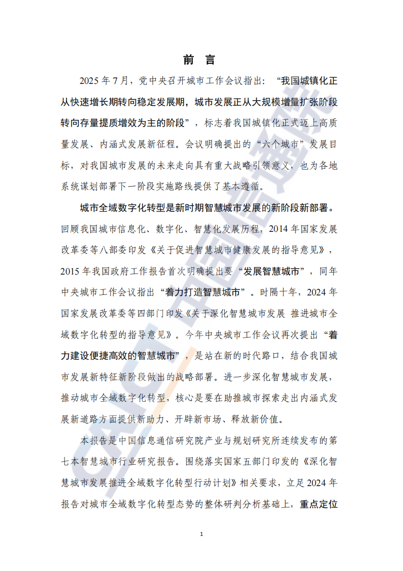本报告是中国信息通信研究院产业与规划研究所连续发布的第七本智慧城市行业研究报告。围绕落实国家五部门印发的《深化智慧城市发展推进全域数字化转型行动计划》相