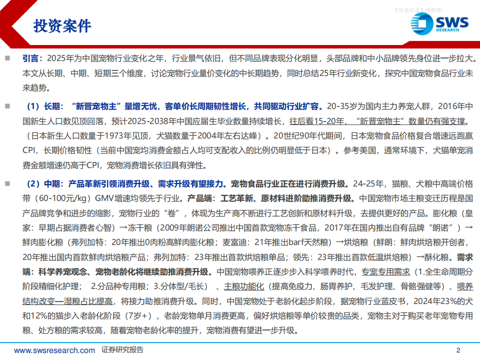 引言:2025年为中国宠物行业变化之年,行业景气依旧,但不同品牌表现分化明显,头部品牌和中小品牌领先身位进一步拉大。本文从长期、中期、短期三个维度,讨论宠物行业量价变化的中长期趋势,同时总结25年行业新变化,探究中国宠物食品行业未来趋势。