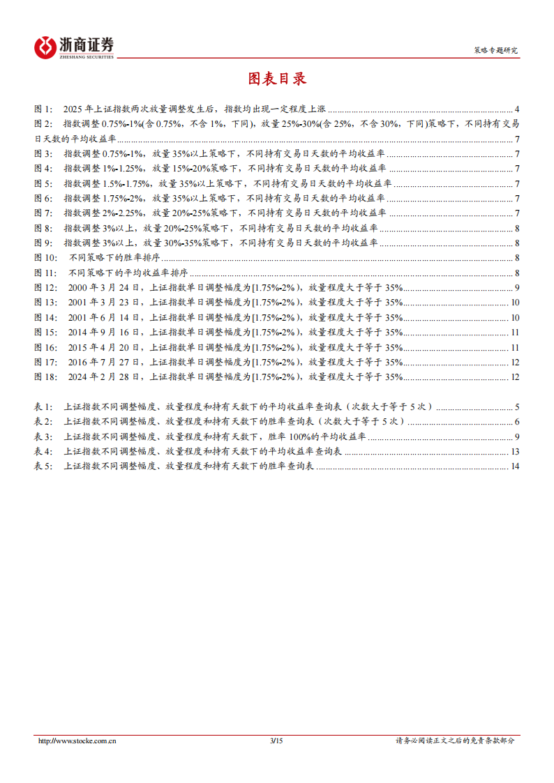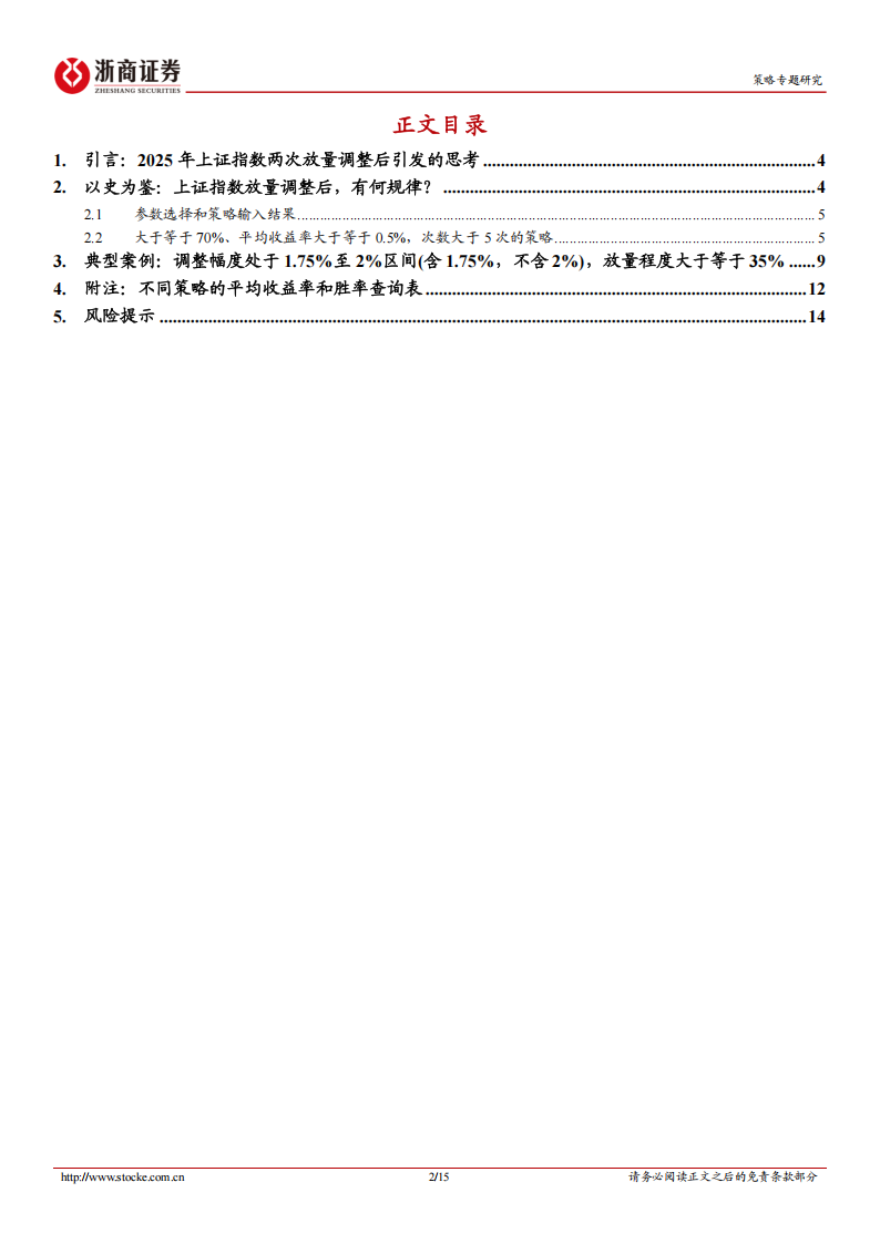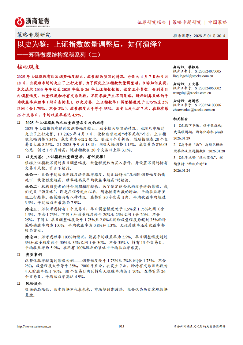 口 以史为鉴:上证指数放量调整后,有何规律?根据上证指数不同的当日调整幅度、放量程度作为买入条件,并设置不同的持有交易日天数。有如下结论:结论一:无论平均收益率维度还是胜率维度,均无法得出“在相同调整幅度的情况下,放量程度越高,胜率越高或平均收益率越高”的结论。结论二:机构投资者的持仓周期相对较长,为了制定适合机构投资者的策略,我们定义“强策略”,即是在信号发出以后,随着持有天数的增加,平均收益率呈现上行趋势。强策略共有八种情况,在持有30个交易日内,平均收益率均超过3.5%,平均收益率最高为7.9%。结论三:若仅考虑持有1个交易日,单日调整幅度处于1.5%至1.75%之间(含1.5%,不含1.75%,下同)和放量程度处于20%至25%之间(含20%,不含25%,下同)、单日调整幅度处于1.75%至2.0%之间和放量程度为超过35%两种策略的胜率均为100%,平均收益率为0.8%和1.3%,无论是胜率还是收益率都较为突出。结论四:若考虑胜率100%的情况,最高平均收益率为5.9%。单日调整幅度超过3%和放量程度处于30%至35%之间(含30%,不含35%),持有13个交易日,平均收益率为5.9%,在所有100%胜率的策略中平均收益率最高。口 典型案例以整体胜率较高的策略为例——调整幅度处于1.75%至2%区间(含1.75%,不含2%),放量程度大于等于35%,2000年至今,共发生7次,除持有交易日天数为4天时胜率低于70%,30个交易日内的持有天数胜率均高于70%,在持有第26个交易日,平均收益率高达4.9%。口 风险提示数据的局限性、历史数据不代表未来、市场超预期波动、报告仅为历史客观数据复盘。