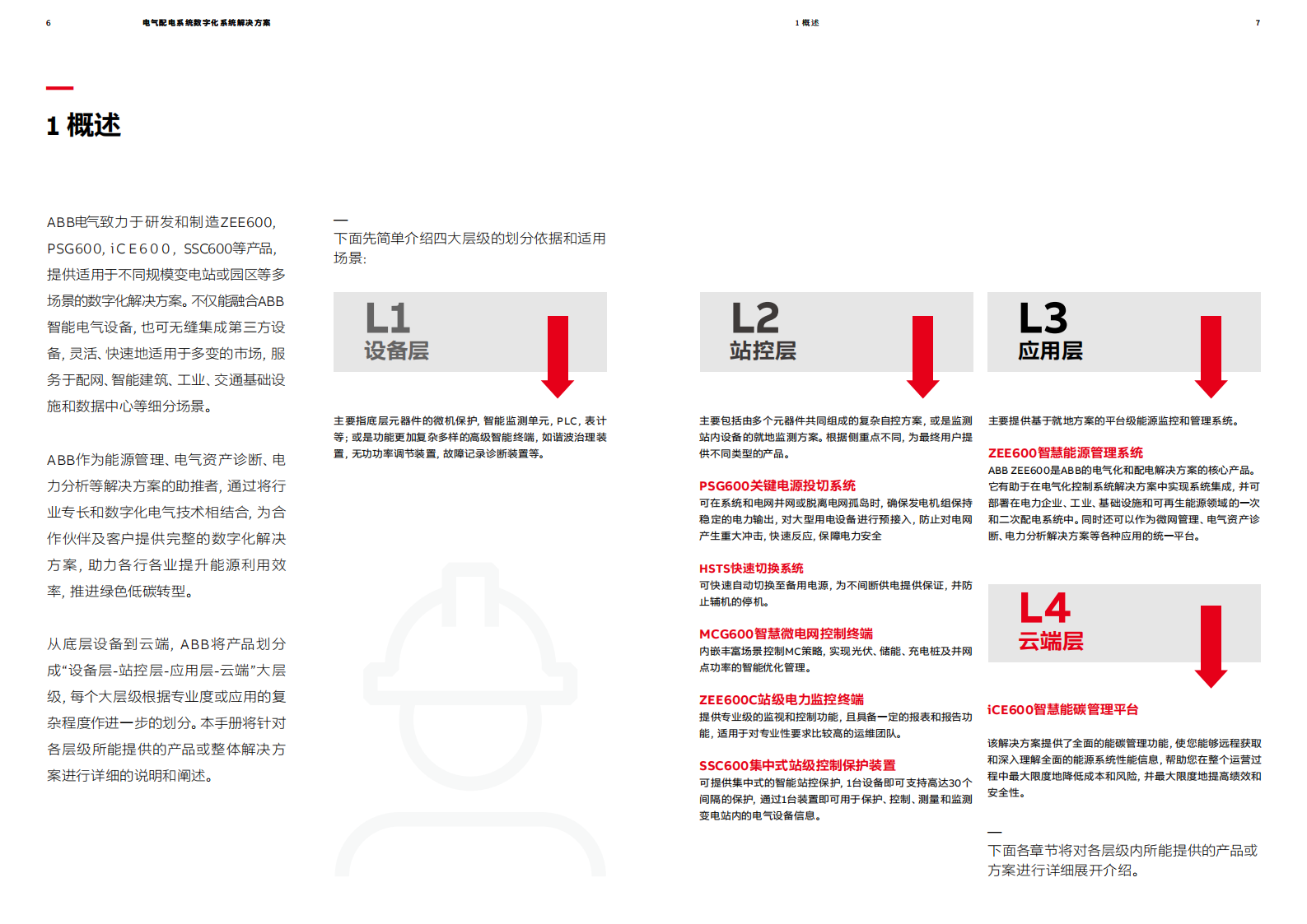 从底层设备到云端,ABB将产品划分成“设备层-站控层-应用层-云端”大层级,每个大层级根据专业度或应用的复杂程度作进一步的划分。本手册将针对各层级所能提供的产品或整体解决方案进行详细的说明和阐述。