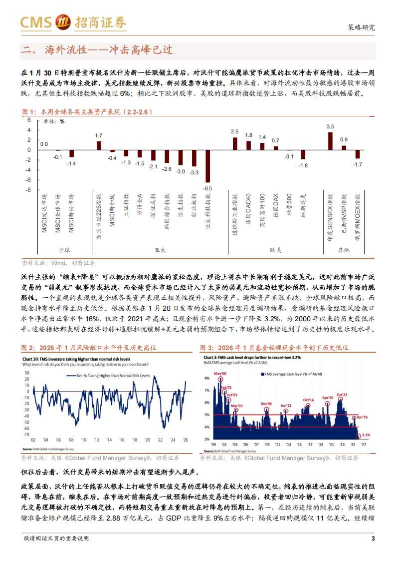 在1月30日特朗普宣布提名沃衍为新一任联储主席后,对沃什可能偏鹰派货币政策的担忧冲击市场情绪,过去一周沃衍交易成为市场主旋律,美元指数继续反弹,新兴股票市场重挫。具体来看,对海外流动性最为敏感的港股市场领跌,尤其恒生科技指数跌幅超过6%;相比之下欧洲股市、美股的道琼斯指数逆势上涨,而美股科技股跌幅居前。沃什主张的“缩表+降息”可以概括为相对鹰派的宽松态度,理论上将在中长期有利于稳定美元,这对此前市场广泛交易的“弱美元”叙事形成挑战,而全球资本市场已经计入了太多的弱美元和流动性宽松预期,从而增加了市场的脆弱性。一个直观的表现就是全球各类资产表现正相关性提升,风险资产、避险资产齐涨齐跌,全球风险敞口极高,而现金持有水平降至历史低位。根据美银在1月20日发布的全球基金经理月度调研结果,受调研的基金经理风险敞口水平净高出正常水平16%,仅次于2021年高点;且现金持有水平进一步下降至3.2%,为2000年以来的历史最低水平,这些指标都表明在经济好转+通胀担忧缓解+美元走弱的预期组合下,市场整体情绪达到了历史性的极度乐观水平。