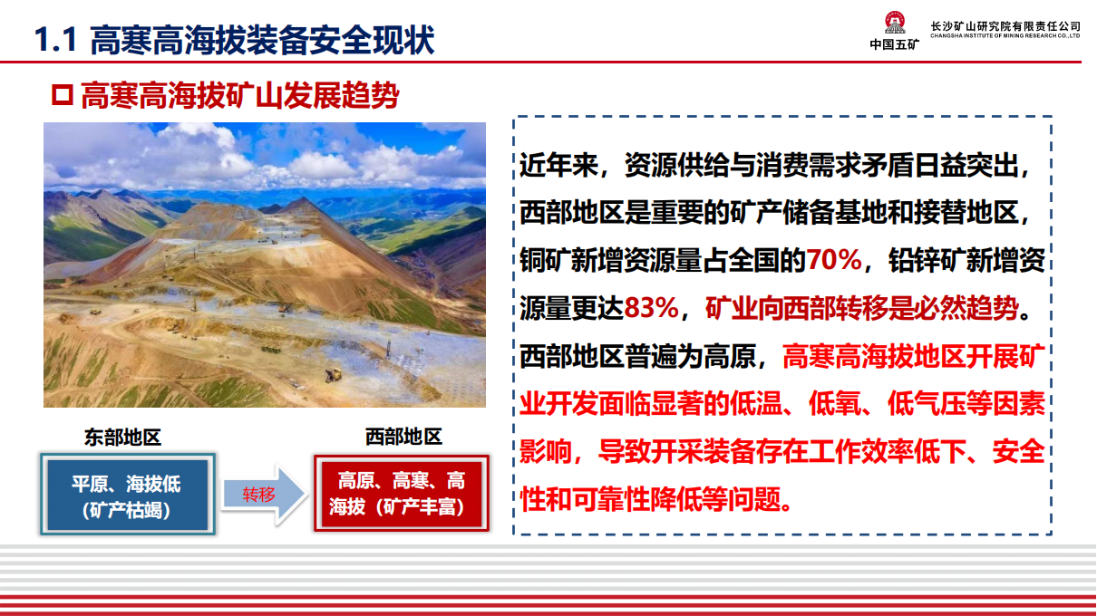 近年来,资源供给与消费需求矛盾日益突出,西部地区是重要的矿产储备基地和接替地区,铜矿新增资源量占全国的70%,铅锌矿新增资源量更达83%,矿业向西部转移是必然趋势。西部地区普遍为高原,高寒高海拔地区开展矿|业开发面临显著的低温、低氧、低气压等因素影响,导致开采装备存在工作效率低下、安全性和可靠性降低等问题。