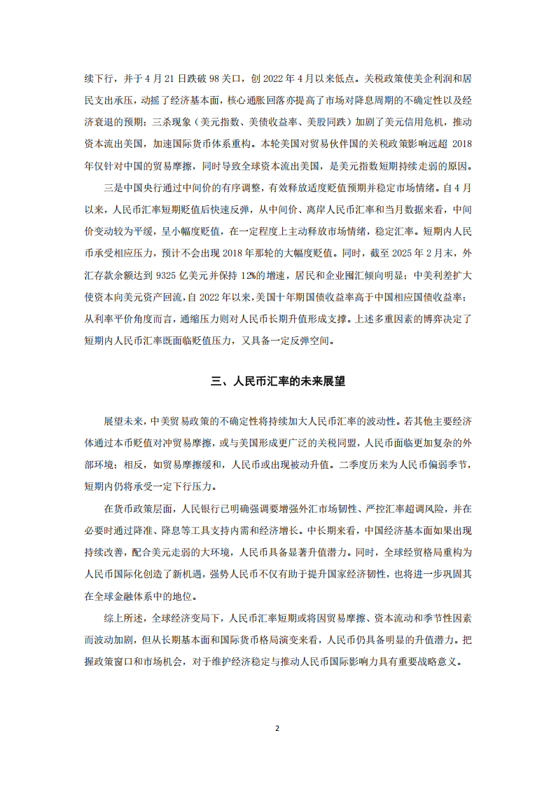展望未来,中美贸易政策的不确定性将持续加大人民币汇率的波动性。若其他主要经济体通过本币贬值对冲贸易摩擦,或与美国形成更广泛的关税同盟,人民币面临更加复杂的外部环境;相反,如贸易摩擦缓和,人民币或出现被动升值。二季度历来为人民币偏弱季节,短期内仍将承受一定下行压力。