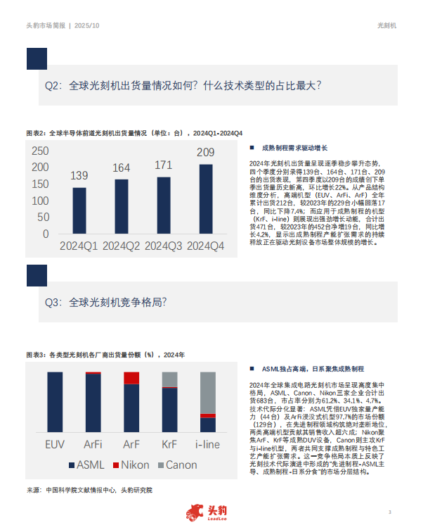 2024年光刻机出货量呈现逐季稳步攀升态势,四个季度分别录得139台、164台、171台、209台的出货表现,第四季度以209台的成绩创下单季出货量历史新高,环比增长22%。从产品结构维度分析,高端机型(EUV、ArFi、ArF)全年累计出货212台,较2023年的229台小幅回落17台,同比下降7.4%;而应用于成熟制程的机型