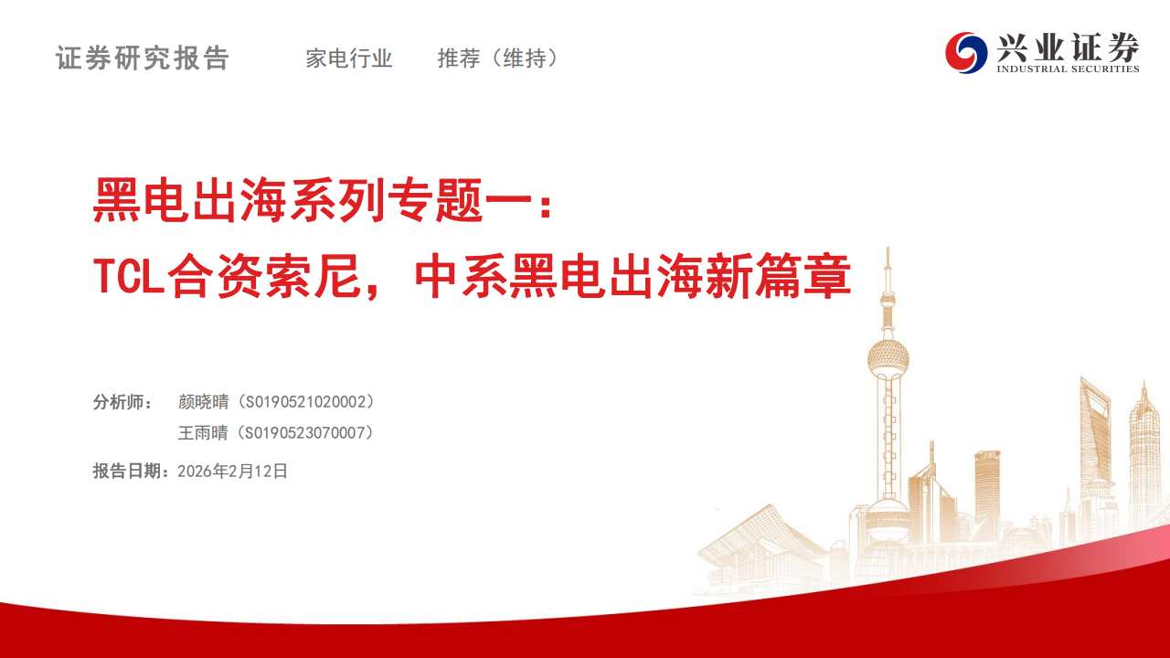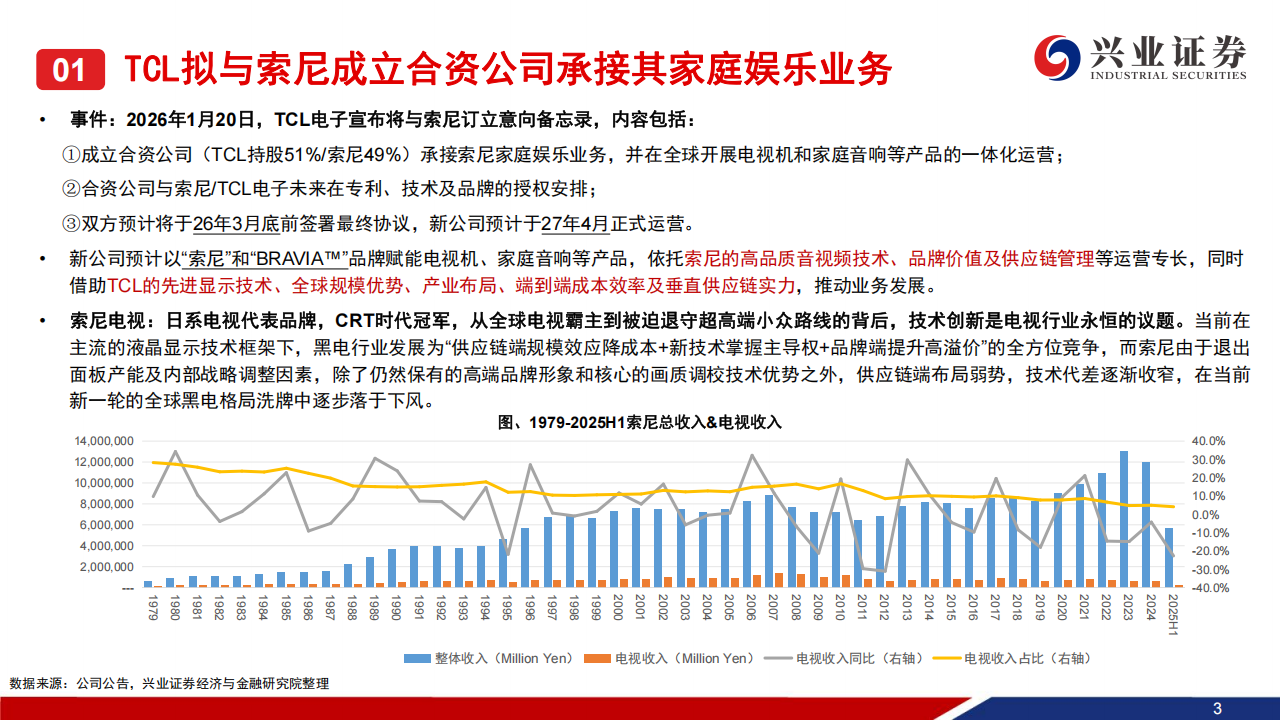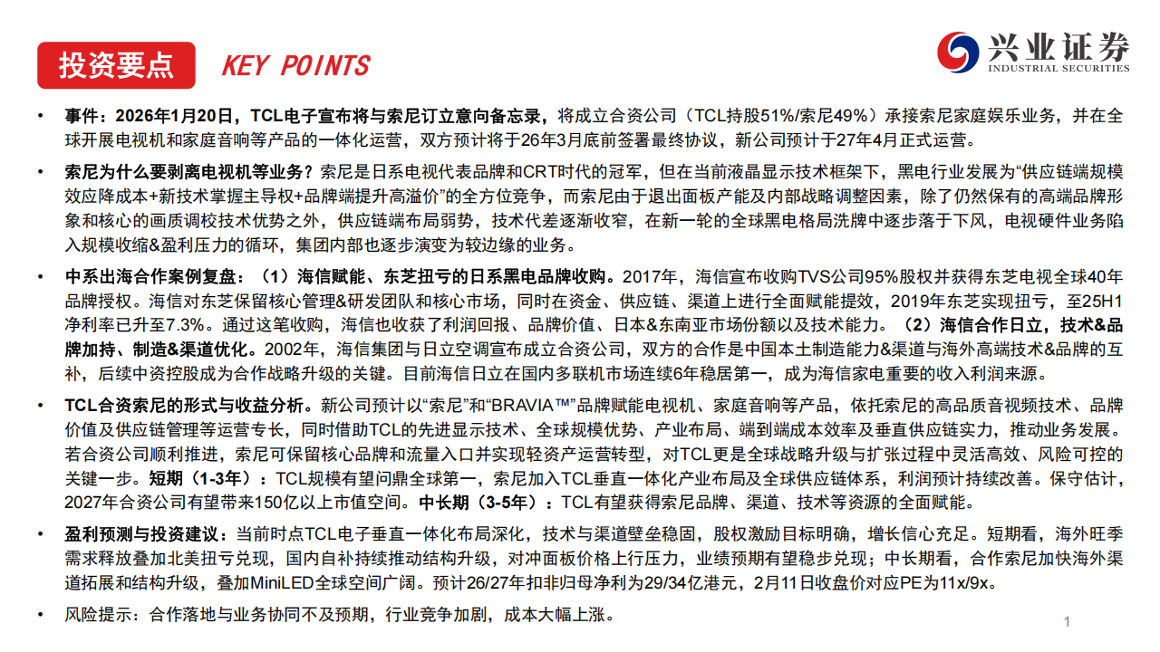 事件:2026年1月20日,TCL电子宣布将与索尼订立意向备忘录,将成立合资公司(TCL持股51%/索尼49%)承接索尼家庭娱乐业务,并在全球开展电视机和家庭音响等产品的一体化运营,双方预计将于26年3月底前签署最终协议,新公司预计于27年4月正式运营。