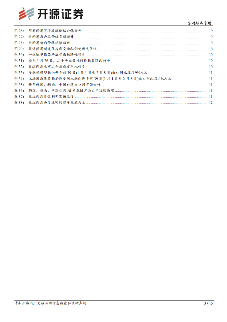2.二手房:成交同比转负。价格方面,截至1月26日,二手房出售挂牌价指数环比持平;成交量方面,最近两周(1月26日至2月8日),北京、上海、深圳二手房成交同比均转负,较2025年农历同期分别同比-2%、-9%、-25%。