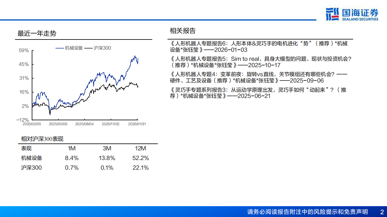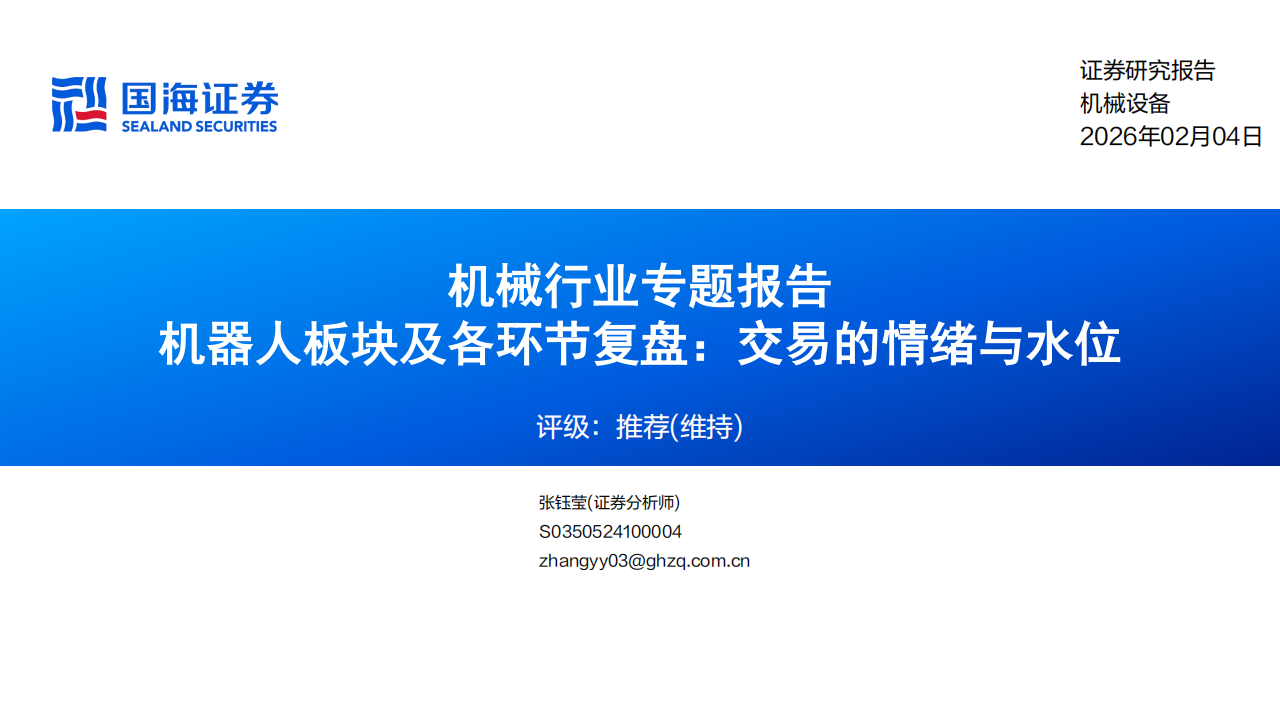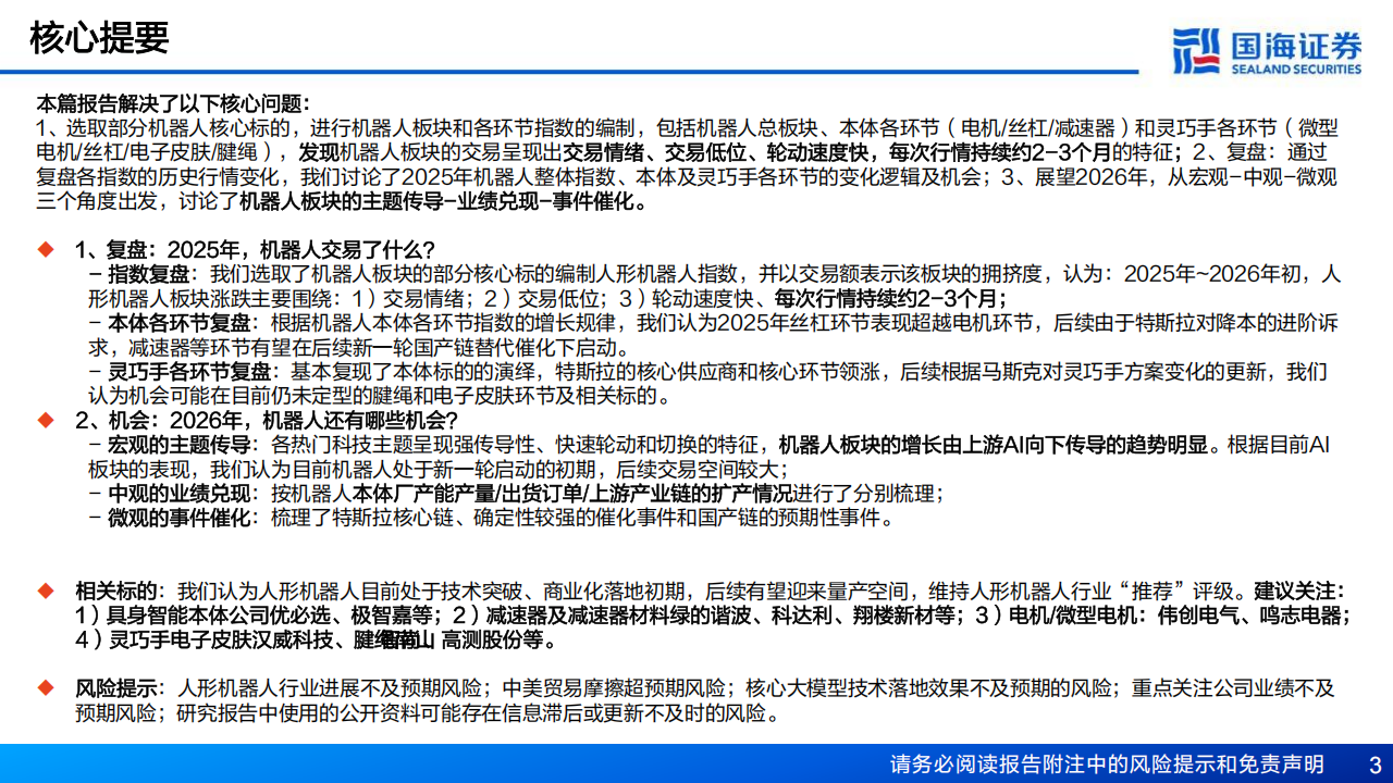 1、选取部分机器人核心标的,进行机器人板块和各环节指数的编制,包括机器人总板块、本体各环节(电机/丝杠/减速器)和灵巧手各环节(微型电机/丝杠/电子皮肤腱绳),发现机器人板块的交易呈现出交易情绪、交易低位、轮动速度快,每次行情持续约2-3个月的特征;2、复盘:通过复盘各指数的历史行情变化,我们讨论了2025年机器人整体指数、本体及灵巧手各环节的变化逻辑及机会;3、展望2026年,从宏观-中观-微观三个角度出发,讨论了机器人板块的主题传导-业绩兑现-事件催化。