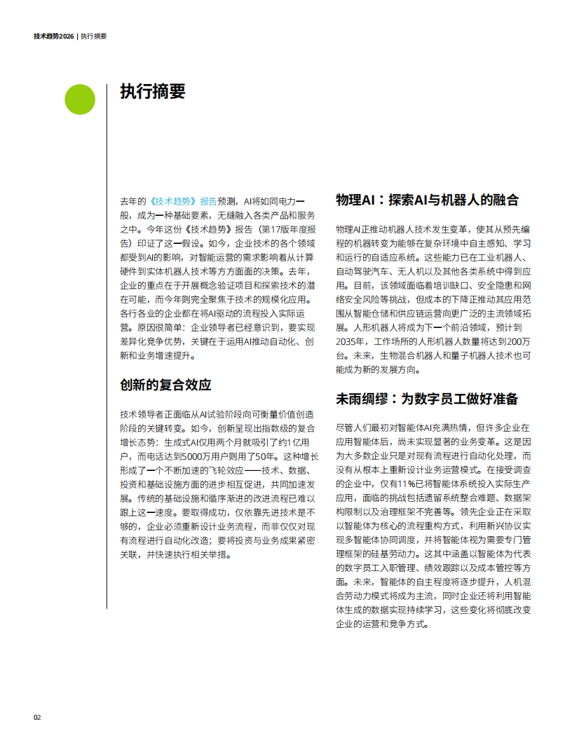 去年的《技术趋势》报告预测,A将如同电力一般,成为一种墨础要素,无爆融入各类产品和服务之中。今年这份《技术趋势》报告(第17质年度报告)印证了这一假设。如今,企业技术的各个领域都受到的影响,对智能运营的需求影响着从计算硬件到实体机器人技术等方方面面的决策。去年,企业的重点在于开展概念验证项目和探索技术的潜在可能,而今年则充全至焦于技术的规模化应用。各行各业的企业都在将网更动的流程投入实际运营。原因祝篱单:企业领导者已经意识到,要实现差异化竞争优势,关键在于运用网推动自动化、创新和业务增速提升。