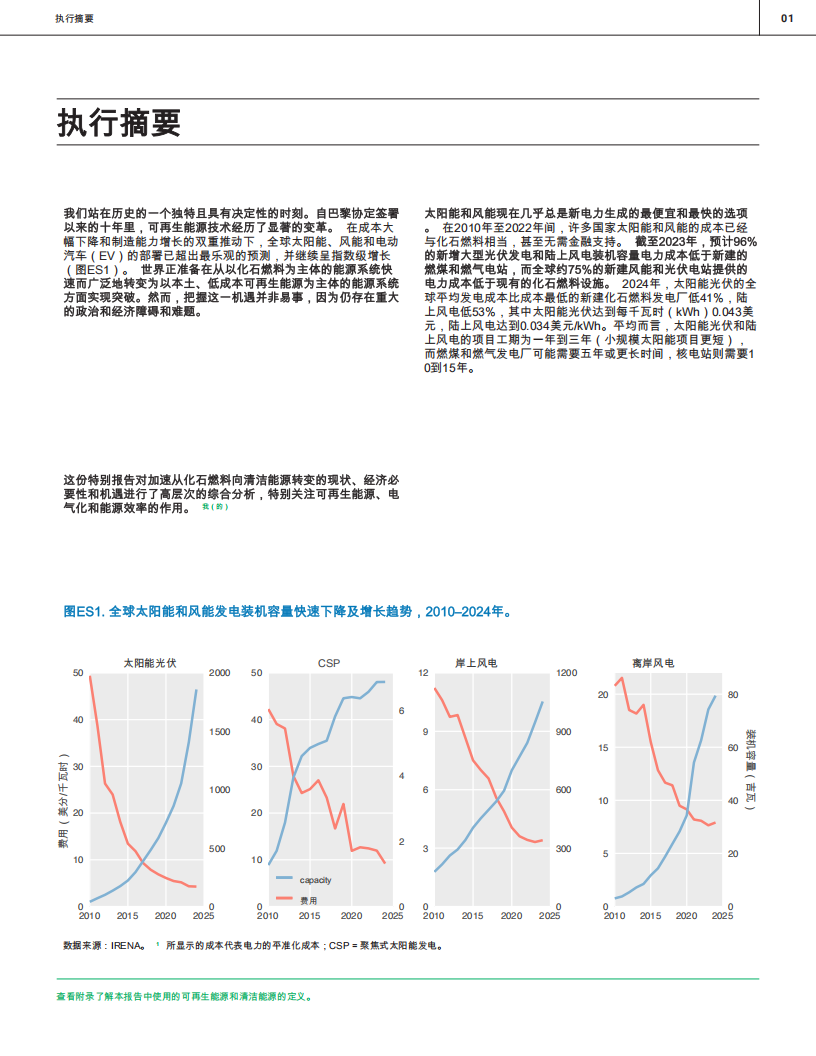 我们站在历史的一个独特且具有决定性的时刻。自巴黎协定签署以来的十年里,可再生能源技术经历了显著的变革。在成本大幅下降和制造能力增长的双重推动下,全球太阳能、风能和电动汽车(EV)的部署已超出最乐观的预测,并继续呈指数级增长(图ES1)。世界正准备在从以化石燃料为主体的能源系统快速而广泛地转变为以本土、低成本可再生能源为主体的能源系统方面实现突破。然而,把握这一机遇并非易事,因为仍存在重大的政治和经济障碍和难题。