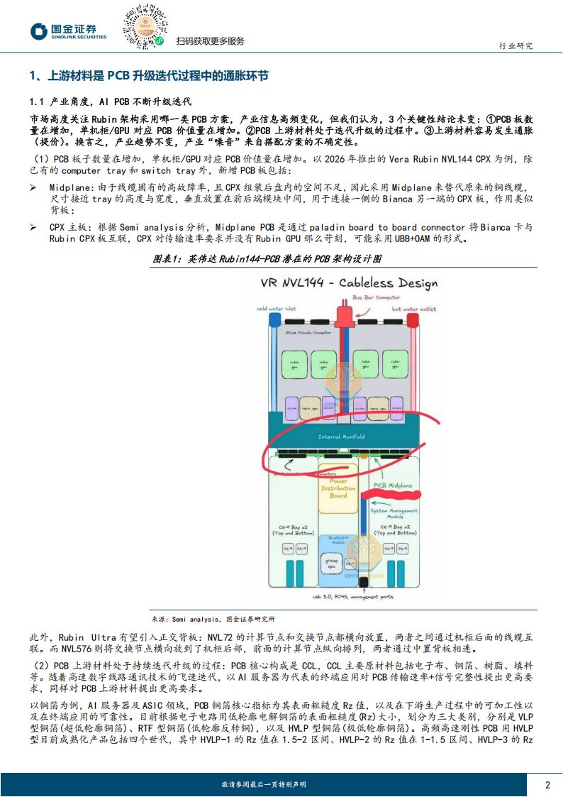 市场高度关注Rubin架构采用哪一类PCB方案,产业信息高频变化,但我们认为,3个关键性结论未变:①PCB板数量在增加,单机柜/GPU对应PCB价值量在增加。②PCB上游材料处于迭代升级的过程中。③上游材料容易发生通胀(提价)。换言之,产业趋势不变,产业“噪音”来自搭配方案的不确定性。
