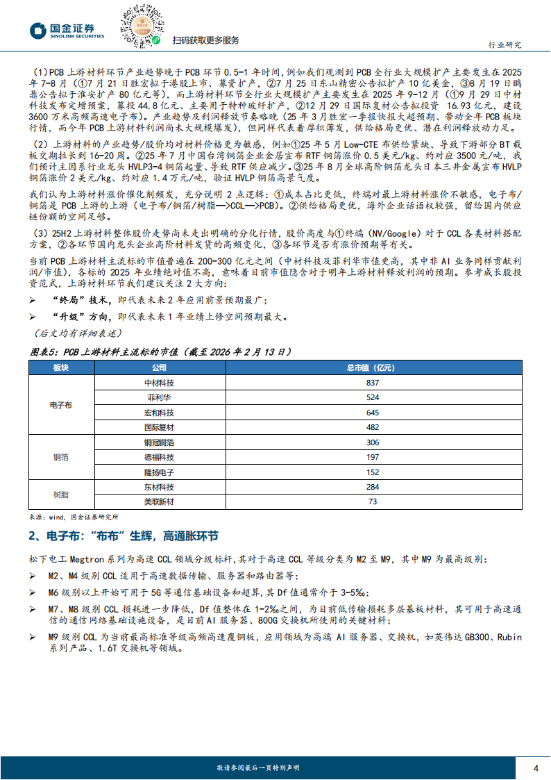 (1)PCB上游材料环节产业趋势晚于PCB环节0.5-1年时间,例如我们观测到PCB全行业大规模扩产主要发生在2025年7-8月(①7月21日胜宏拟于港股上市、募资扩产,②7月25日东山精密公告拟扩产10亿美金,③8月19日鹏鼎公告拟于淮安扩产80亿元等),而上游材料环节全行业大规模扩产主要发生在2025年9-12月(①9月29日中材科技发布定增预案,募投44.8亿元、主要用于特种玻纤扩产,②12月29日国际复材公告拟投资16.93亿元,建设3600万米高频高速电子布)。产业趋势及利润释放节奏略晚(25年3月胜宏一季报快报大超预期、带动全年PCB板块行情,而今年PCB上游材料利润尚未大规模爆发),但同样代表着厚积薄发,供给格局更优、潜在利润释放动力足。