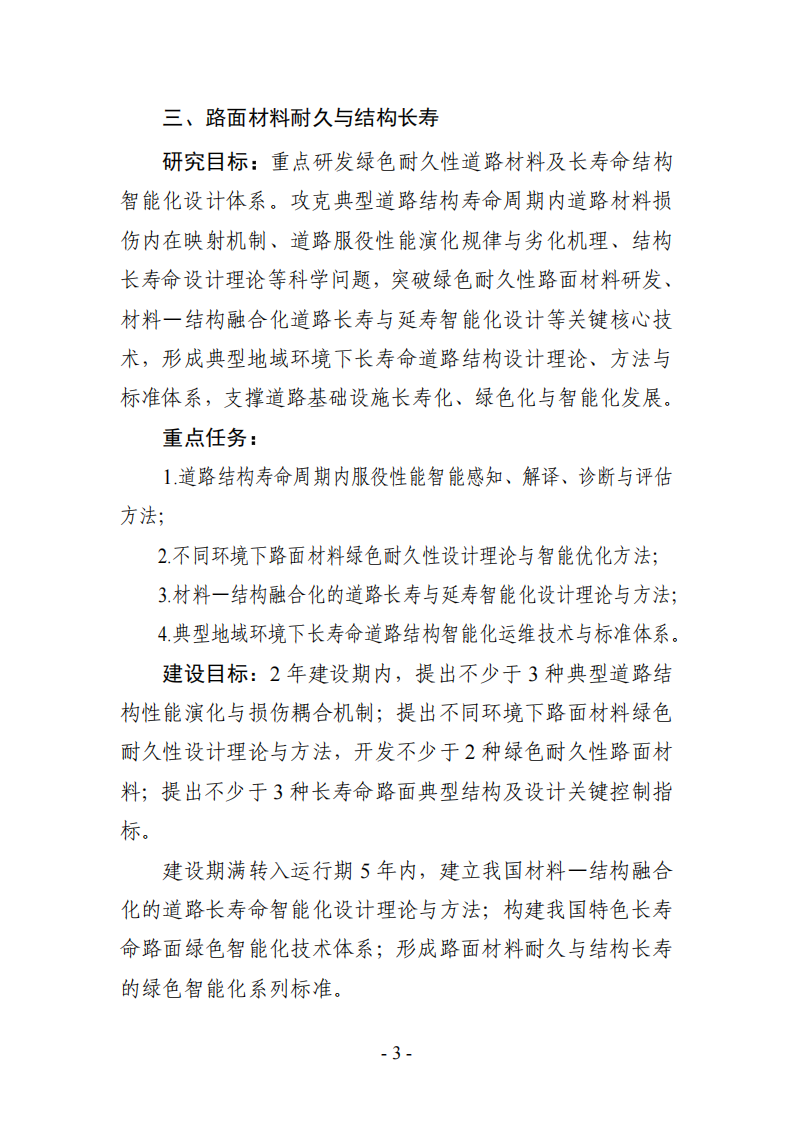 研究目标:重点研发绿色耐久性道路材料及长寿命结构智能化设计体系。攻克典型道路结构寿命周期内道路材料损伤内在映射机制、道路服役性能演化规律与劣化机理、结构长寿命设计理论等科学问题,突破绿色耐久性路面材料研发、材料一结构融合化道路长寿与延寿智能化设计等关键核心技术,形成典型地域环境下长寿命道路结构设计理论、方法与标准体系,支撑道路基础设施长寿化、绿色化与智能化发展。