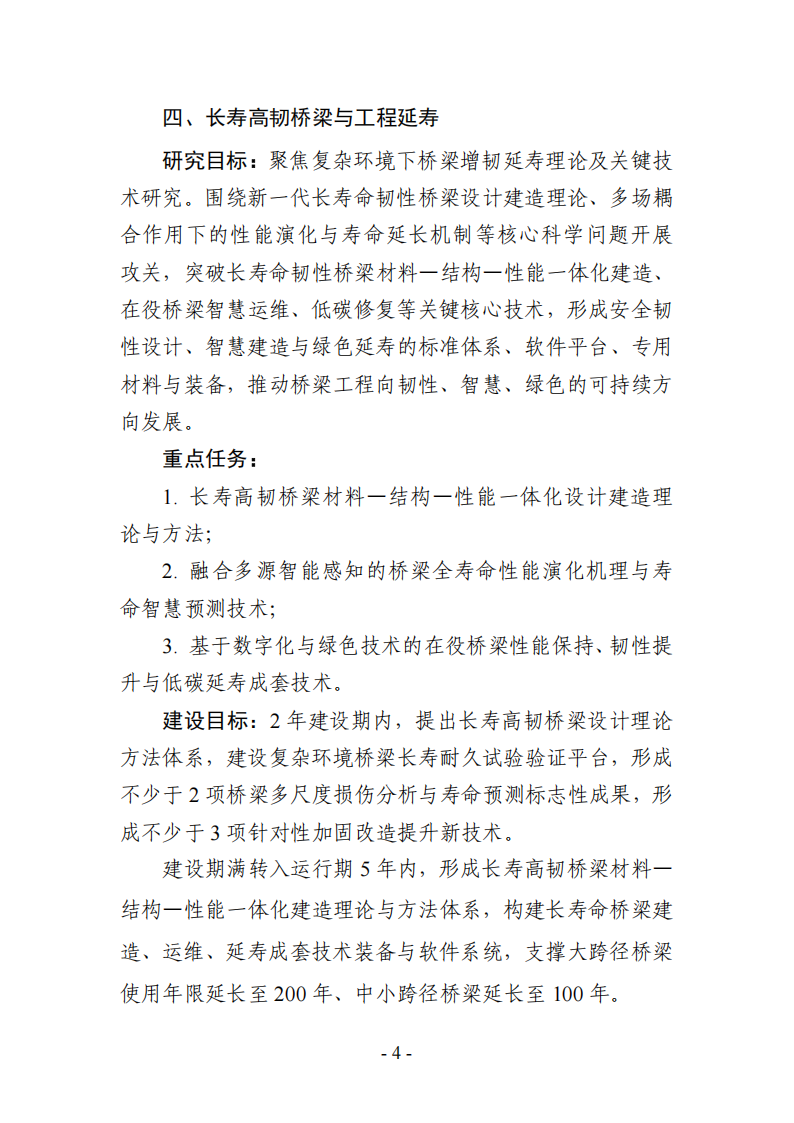 建设期满转入运行期5年内,形成长寿高韧桥梁材料一结构一性能一体化建造理论与方法体系,构建长寿命桥梁建造、运维、延寿成套技术装备与软件系统,支撑大跨径桥梁使用年限延长至200年、中小跨径桥梁延长至100年。