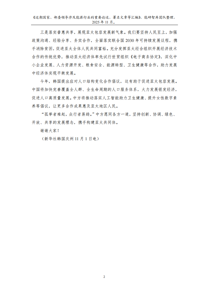 二是坚持绿色低碳,打造亚太可持续发展新范式。绿水青山就是金山银山。我们要本着对子孙后代负责的态度,加强各经济体绿色发展战略对接,促进优质绿色技术和产品自由流通,加快推动发展方式绿色低碳转型,积极应对气候变化。切实履行共同但有区别的责任,敦促发达经济体向发展中经济体持续提供必要的资金、技术、能力建设等方面支持。中国自5年前宣布碳达峰碳中和目标以来,已经建成全球最大、发展最快的可再生能源体系,新能源汽车、锂电池、光伏等产业蓬勃发展。中国已经提交应对气候变化2035年国家自主贡献目标,将全面实施碳排放总量和强度双控制度。中方捐资设立亚太经合组织数字化绿色化转型子基金,将继续落实清洁能源、绿色转型相关倡议。《近期国家、部委领导涉及能源行业的重要论述、署名文章等汇编》,能研智库团队整理,2025年11月。