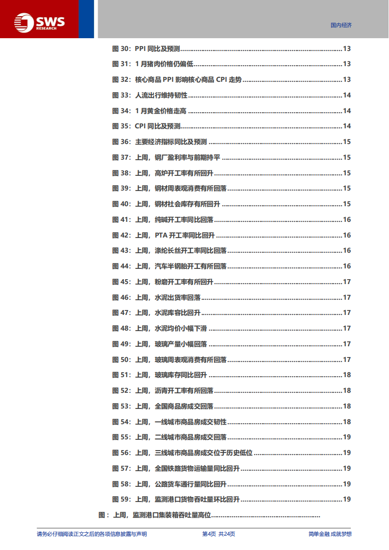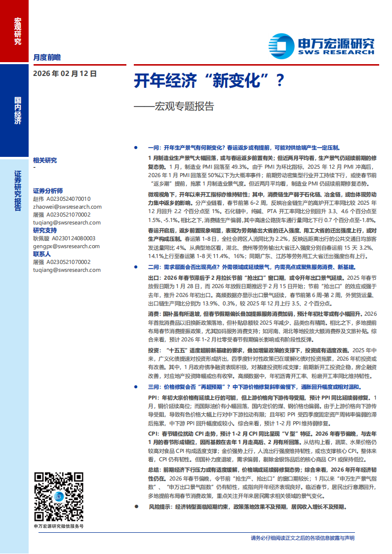 总结:前期经济下行压力或有适度缓解,价格端或延续弱修复态势;综合来看,2026年开年经济韧性仍在。2026年春节偏晚,令节前“抢生产、抢出口”的窗口期较长;1月以来“申万生产景气指数”、“申万出口景气指数”仍有韧性,或指向开年经济表现良好。临近春节,居民出行意愿回升,多地提前布局春节消费政策,重点关注开年来居民需求相关领域的景气变化。