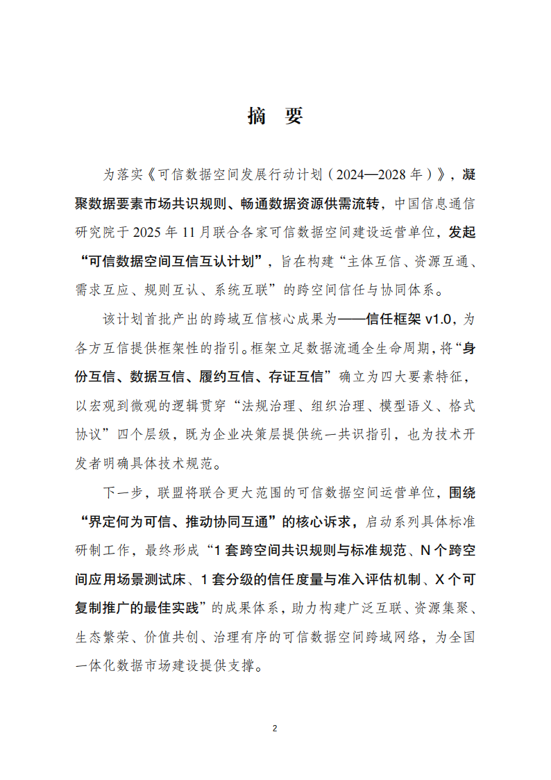 本框架规定了可信数据空间跨空间互信互认的总体框架。本框架适用于各类可信数据空间跨域互联的规划、建设及评估参考。