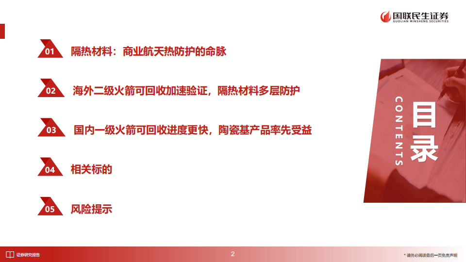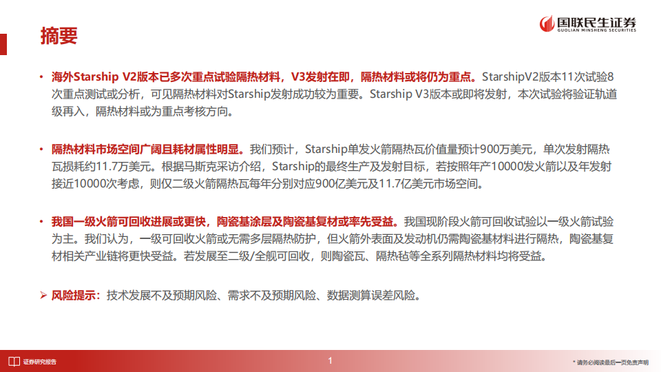 我国一级火箭可回收进展或更快,陶瓷基涂层及陶瓷基复材或率先受益。我国现阶段火箭可回收试验以一级火箭试验为主。我们认为,一级可回收火箭或无需多层隔热防护,但火箭外表面及发动机仍需陶瓷基材料进行隔热,陶瓷基复材相关产业链将更快受益。若发展至二级/全舰可回收,则陶瓷瓦、隔热毡等全系列隔热材料均将受益。