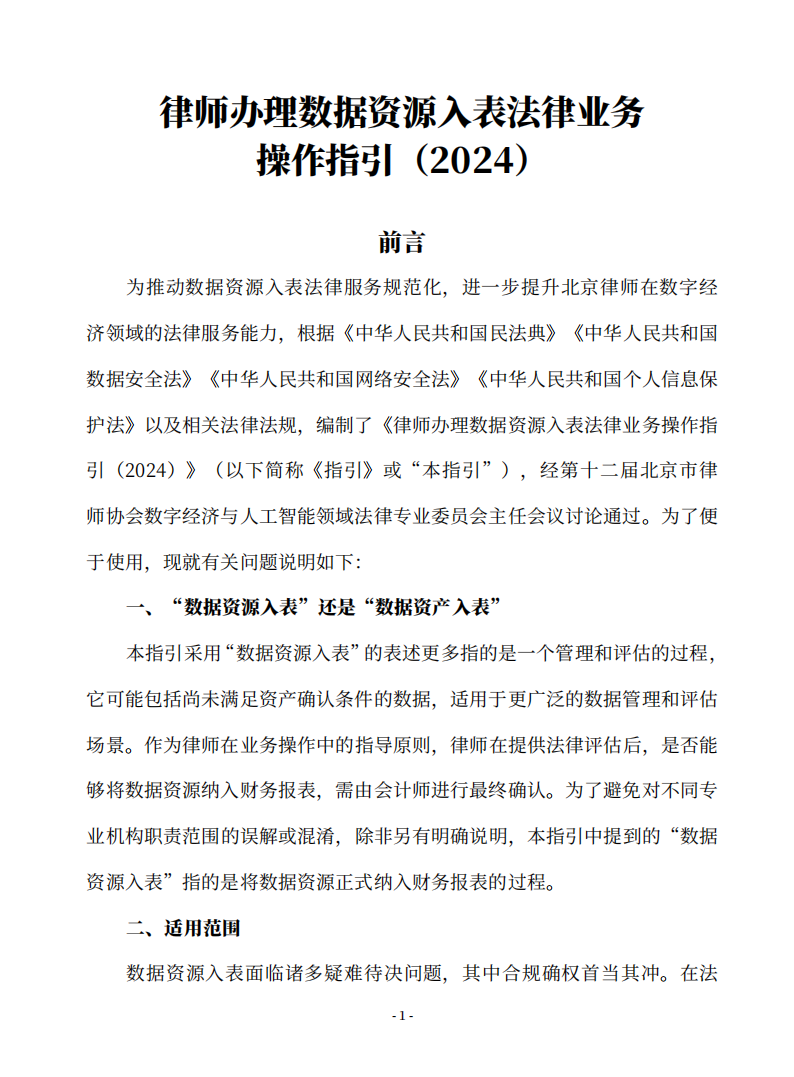 为推动数据资源入表法律服务规范化,进一步提升北京律师在数字经济领域的法律服务能力,根据《中华人民共和国民法典》《中华人民共和国数据安全法》《中华人民共和国网络安全法》《中华人民共和国个人信息保护法》以及相关法律法规,编制了《律师办理数据资源入表法律业务操作指引(2024)》(以下简称《指引》或“本指引”),经第十二届北京市律师协会数字经济与人工智能领域法律专业委员会主任会议讨论通过。为了便于使用,现就有关问题说明如下: