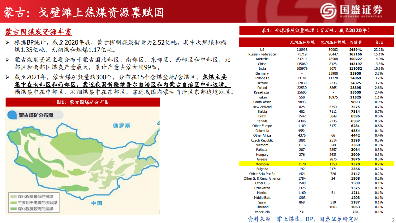 根据BP统计,截至2020年底,蒙古探明煤炭储量为2.52亿吨,其中次烟煤和褐煤1.35亿吨,无烟煤和烟煤1.17亿吨。