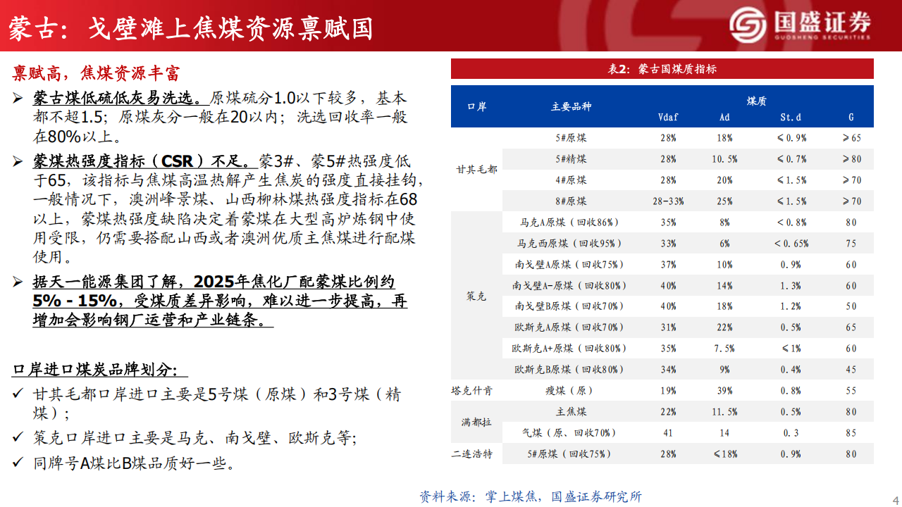 据天一能源集团了解,2025年焦化厂配蒙煤比例约5%-15%,受煤质差异影响,难以进一步提高,再增加会影响钢厂运营和产业链条。