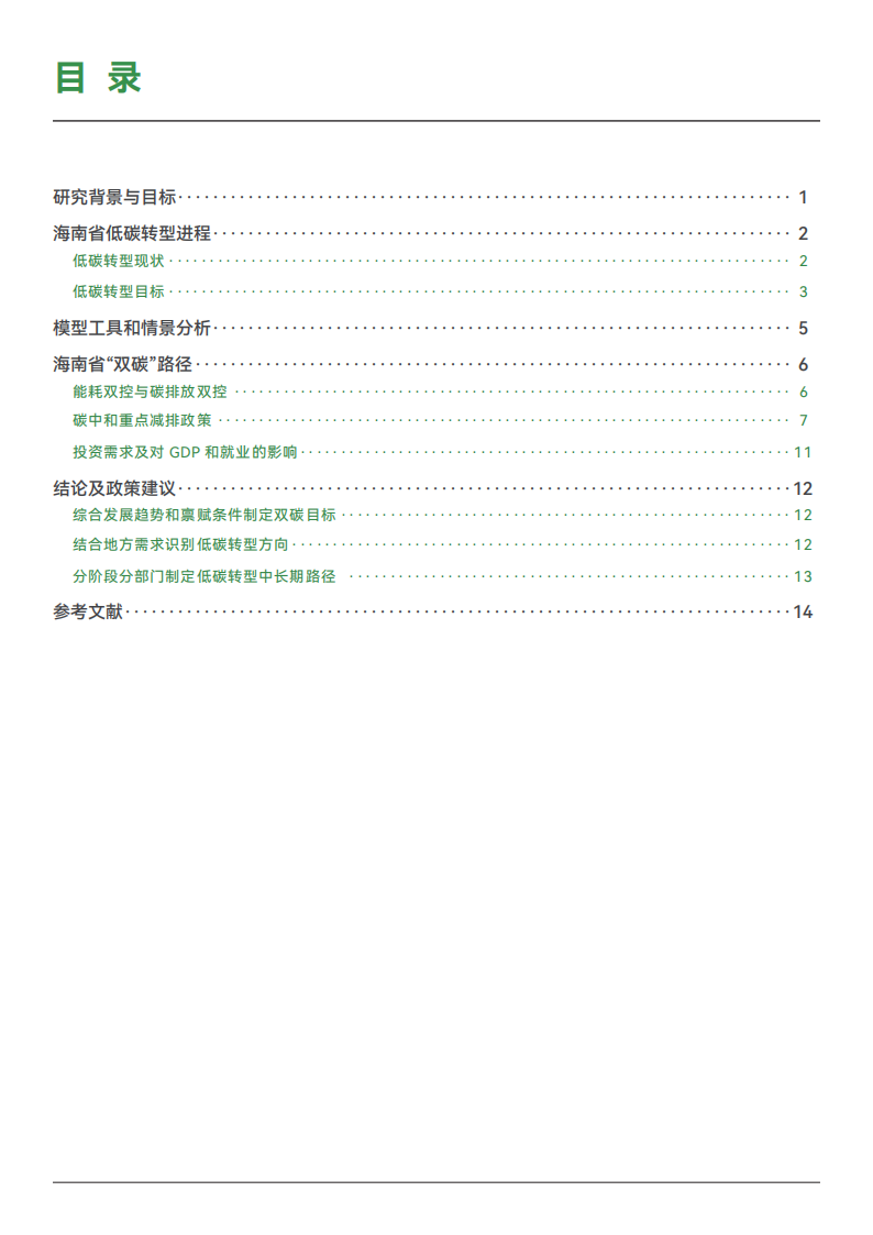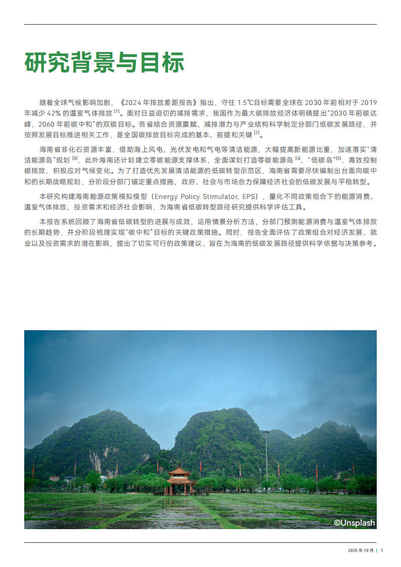 本报告系统回顾了海南省低碳转型的进展与成效,运用情景分析方法,分部门预测能源消费与温室气体排放的长期趋势,并分阶段梳理实现“碳中和”目标的关键政策措施。同时,报告全面评估了政策组合对经济发展、就业以及投资需求的潜在影响,提出了切实可行的政策建议,旨在为海南的低碳发展路径提供科学依据与决策参考。