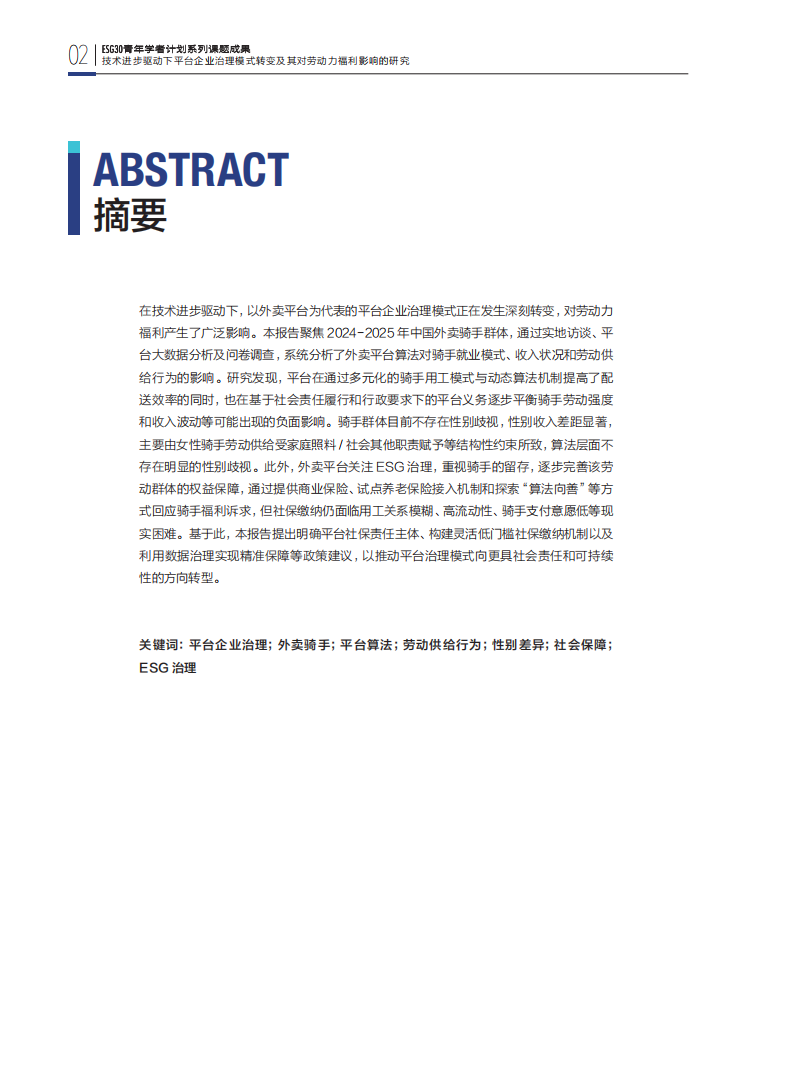 在技术进步驱动下,以外卖平台为代表的平台企业治理模式正在发生深刻转变,对劳动力福利产生了广泛影响。本报告聚焦2024-2025年中国外卖骑手群体,通过实地访谈、平台大数据分析及问卷调查,系统分析了外卖平台算法对骑手就业模式、收入状况和劳动供给行为的影响。研究发现,平台在通过多元化的骑手用工模式与动态算法机制提高了配送效率的同时,也在基于社会责任履行和行政要求下的平台义务逐步平衡骑手劳动强度和收入波动等可能出现的负面影响。骑手群体目前不存在性别歧视,性别收入差距显著,主要由女性骑手劳动供给受家庭照料/社会其他职责赋予等结构性约束所致,算法层面不存在明显的性别歧视。此外,外卖平台关注ESG治理,重视骑手的留存,逐步完善该劳动群体的权益保障,通过提供商业保险、试点养老保险接入机制和探索“算法向善”等方式回应骑手福利诉求,但社保缴纳仍面临用工关系模糊、高流动性、骑手支付意愿低等现实困难。基于此,本报告提出明确平台社保责任主体、构建灵活低门槛社保缴纳机制以及利用数据治理实现精准保障等政策建议,以推动平台治理模式向更具社会责任和可持续性的方向转型。