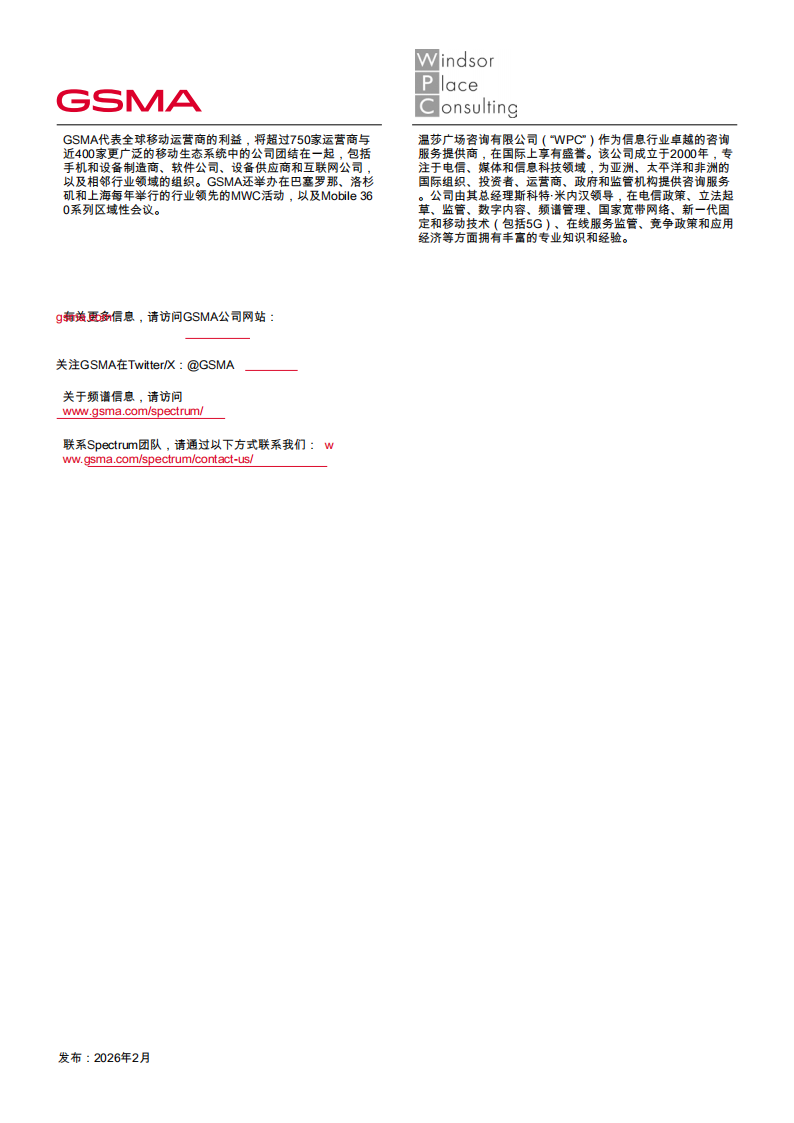 GSMA代表全球移动运营商的利益,将超过750家运营商与近400家更广泛的移动生态系统中的公司团结在一起,包括手机和设备制造商、软件公司、设备供应商和互联网公司,以及相邻行业领域的组织。GSMA还举办在巴塞罗那、洛杉矶和上海每年举行的行业领先的MWC活动,以及Mobile 360系列区域性会议。温莎广场咨询有限公司(“WPC”)作为信息行业卓越的咨询服务提供商,在国际上享有盛誉。该公司成立于2000年,专注于电信、媒体和信息科技领域,为亚洲、太平洋和非洲的国际组织、投资者、运营商、政府和监管机构提供咨询服务。公司由其总经理斯科特·米内汉领导,在电信政策、立法起草、监管、数字内容、频谱管理、国家宽带网络、新一代固定和移动技术(包括5G)、在线服务监管、竞争政策和应用经济等方面拥有丰富的专业知识和经验。