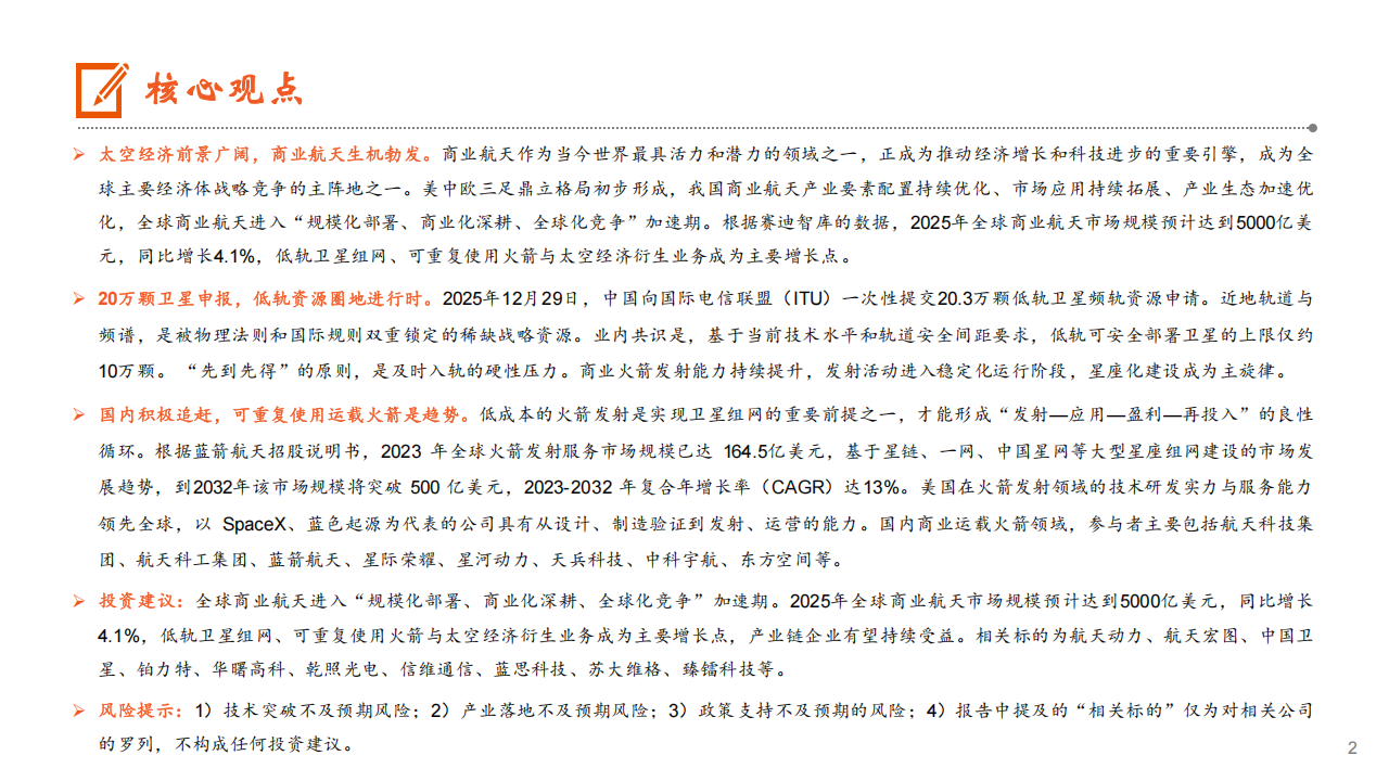 投资建议:全球商业航天进入“规模化部署、商业化深耕、全球化竞争”加速期。2025年全球商业航天市场规模预计达到5000亿美元,同比增长4.1%,低轨卫星组网、可重复使用火箭与太空经济衍生业务成为主要增长点,产业链企业有望持续受益。相关标的为航天动力、航天宏图、中国卫星、铂力特、华曙高科、乾照光电、信维通信、蓝思科技、苏大维格、臻镭科技等。