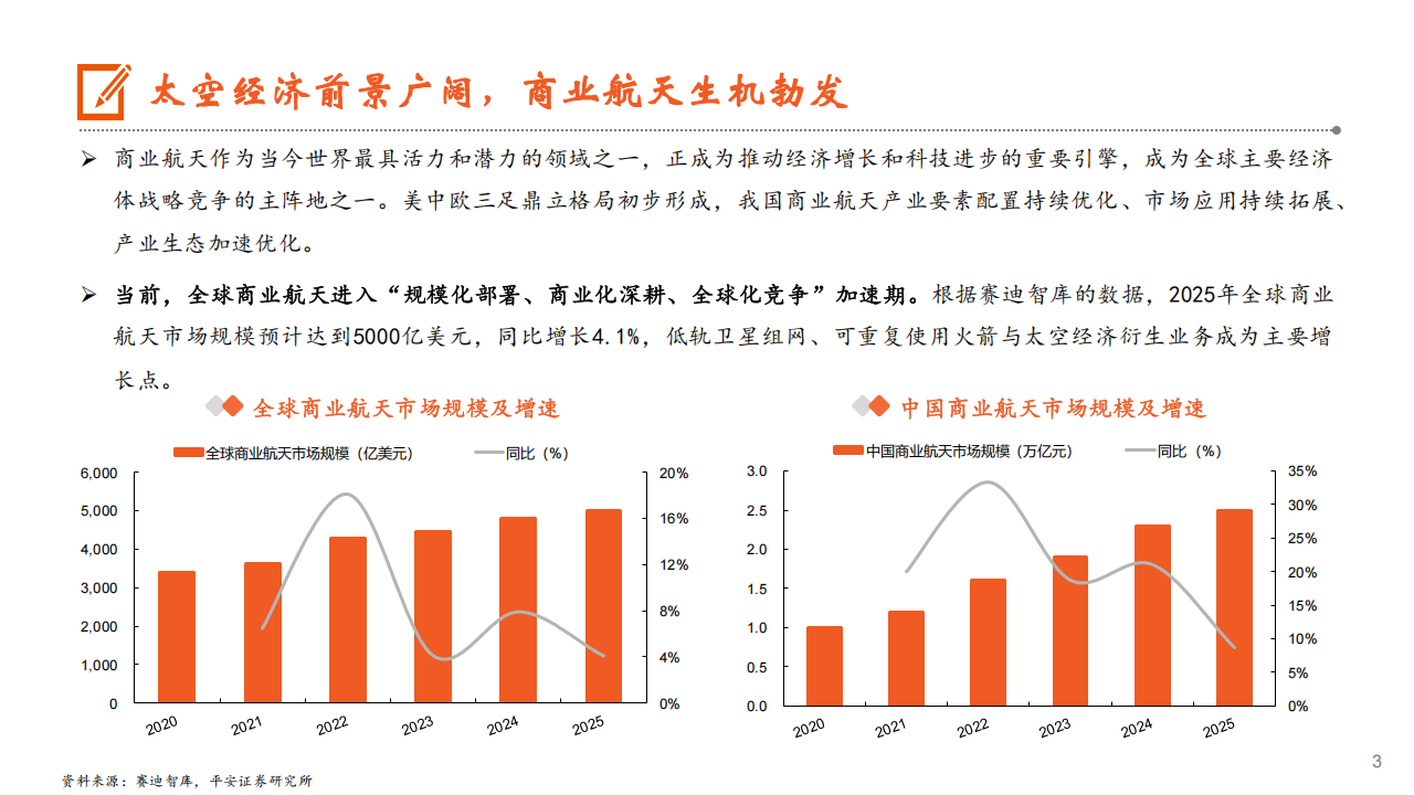 太空经济前景广阔,商业航天生机勃发。商业航天作为当今世界最具活力和潜力的领域之一,正成为推动经济增长和科技进步的重要引擎,成为全球主要经济体战略竞争的主阵地之一。美中欧三足鼎立格局初步形成,我国商业航天产业要素配置持续优化、市场应用持续拓展、产业生态加速优化,全球商业航天进入“规模化部署、商业化深耕、全球化竞争”加速期。根据赛迪智库的数据,2025年全球商业航天市场规模预计达到5000亿美元,同比增长4.1%,低轨卫星组网、可重复使用火箭与太空经济衍生业务成为主要增长点。