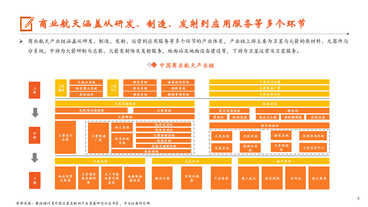 商业航天产业链涵盖从研发、制造、发射、运营到应用服务等多个环节的产业体系,产业链上游主要为卫星与火箭的原材料、元器件与