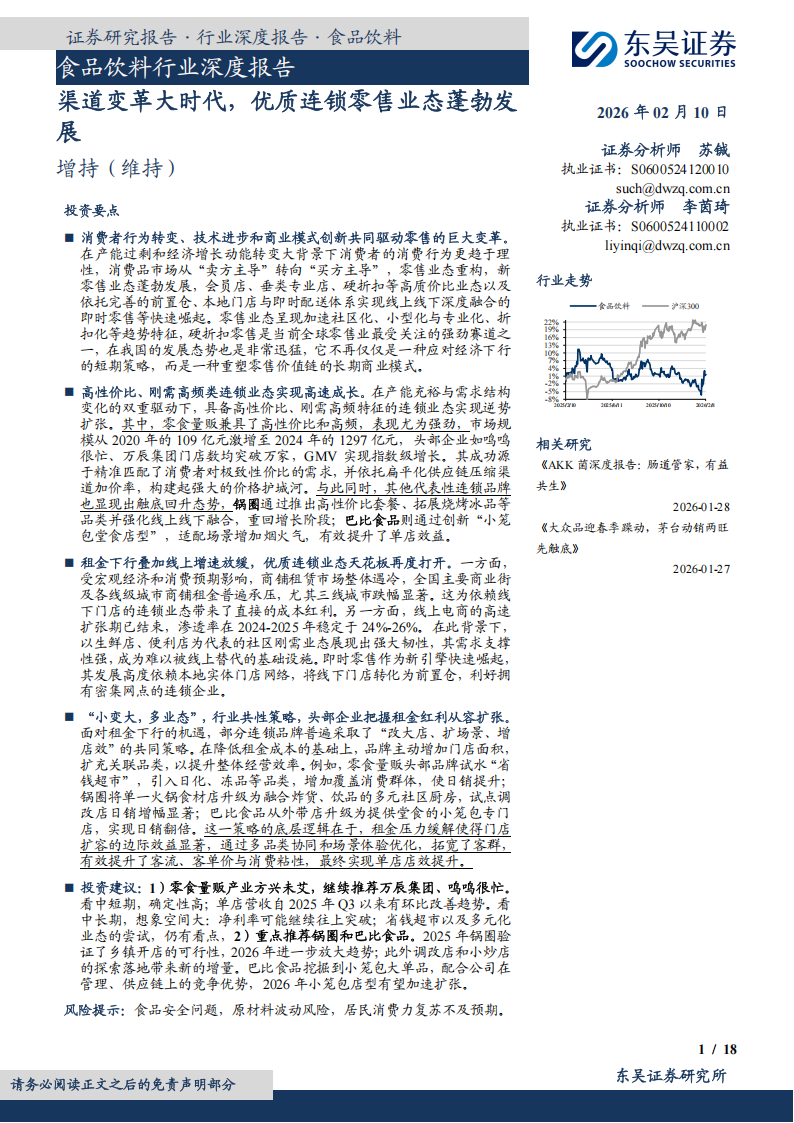■投资建议:1)零食量贩产业方兴未艾,继续推荐万辰集团、鸣鸣很忙。看中短期,确定性高;单店营收自2025年Q3以来有环比改善趋势。看中长期,想象空间大:净利率可能继续往上突破;省钱超市以及多元化业态的尝试,仍有看点,2)重点推荐锅圈和巴比食品。2025年锅圈验证了乡镇开店的可行性,2026年进一步放大趋势;此外调改店和小炒店的探索落地带来新的增量。巴比食品挖掘到小笼包大单品,配合公司在管理、供应链上的竞争优势,2026年小笼包店型有望加速扩张。