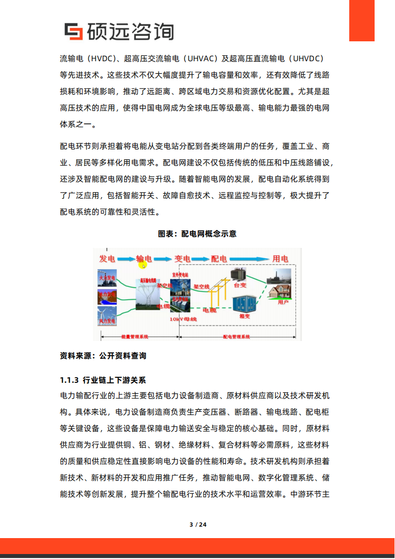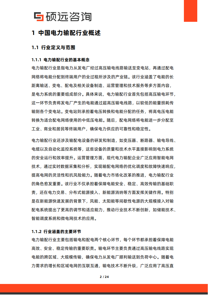 电力输配行业是指电力从发电厂经过高压输电线路输送至变电站,再通过配电网络将电能分配到终端用户的全过程所涉及的产业链。该行业涵盖了电能的长距离输送、变电、配电及相关设备制造、运营管理和技术服务等多方面内容,是电力系统的重要组成部分。具体来说,电力输配行业首先包括高压输电环节,这一环节负责将发电厂产生的电能通过超高压输电线路,以较低的能量损耗传输到各个变电站。变电站则承担着电压转换和电能分配的任务,将高电压电能转换为适合配电网络使用的中低压电能。随后,配电网络将电能进一步分配至工业、商业和居民等终端用户,确保电力供应的可靠性和稳定性。