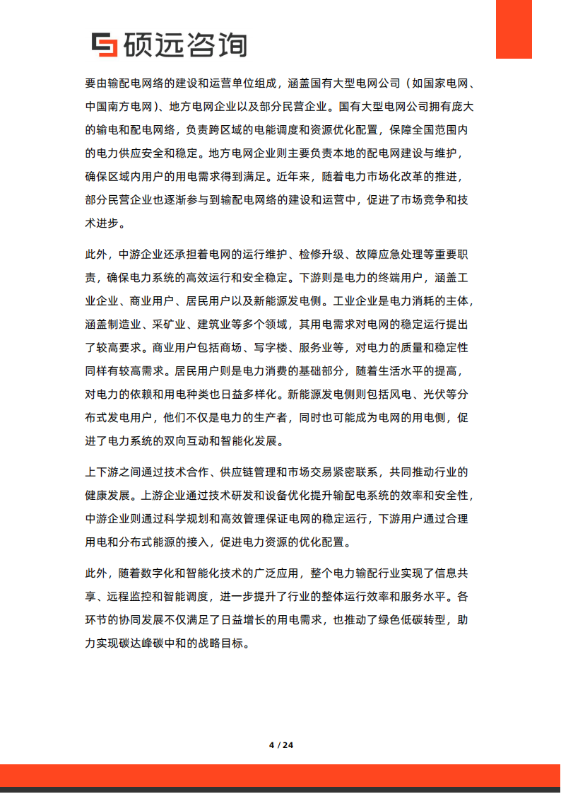 此外,随着数字化和智能化技术的广泛应用,整个电力输配行业实现了信息共享、远程监控和智能调度,进一步提升了行业的整体运行效率和服务水平。各环节的协同发展不仅满足了日益增长的用电需求,也推动了绿色低碳转型,助力实现碳达峰碳中和的战略目标。