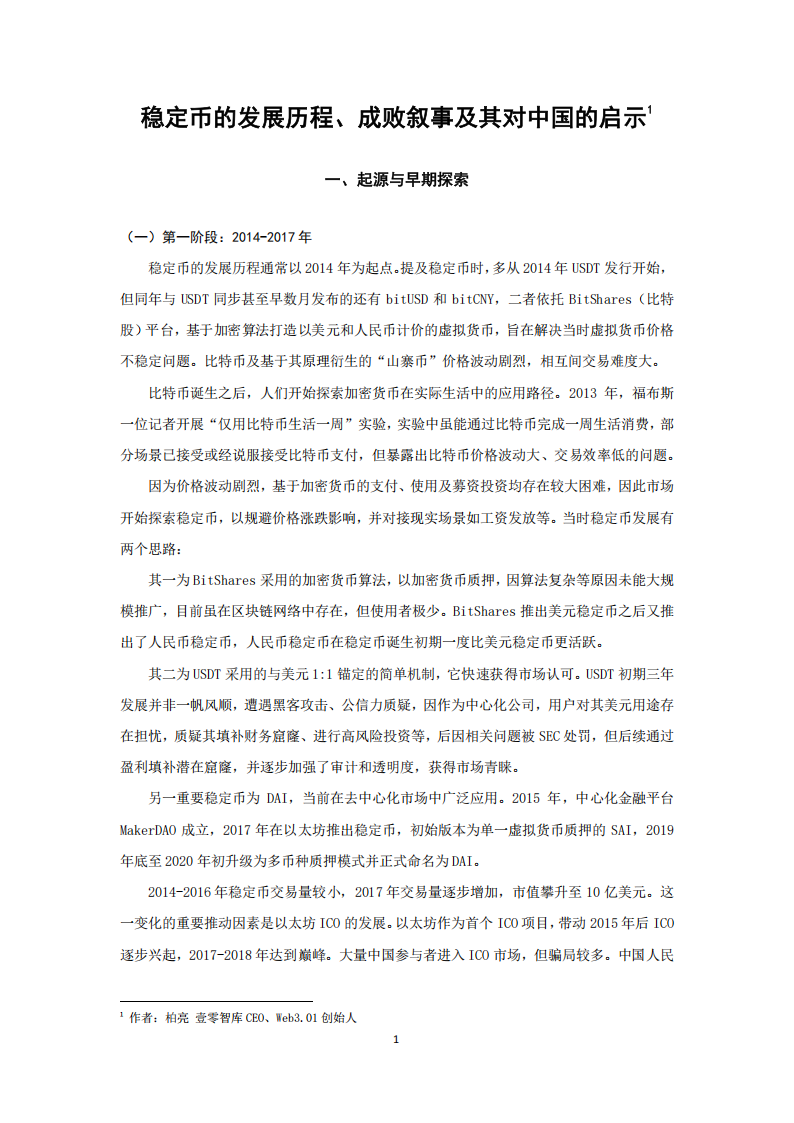 稳定币的发展历程通常以2014年为起点。提及稳定币时,多从2014年USDT发行开始,但同年与USDT同步甚至早数月发布的还有bitUSD和bitCNY,二者依托BitShares(比特股)平台,基于加密算法打造以美元和人民币计价的虚拟货币,旨在解决当时虚拟货币价格不稳定问题。比特币及基于其原理衍生的“山寨币”价格波动剧烈,相互间交易难度大。