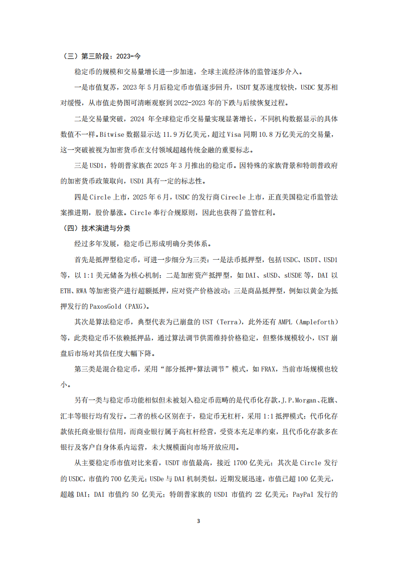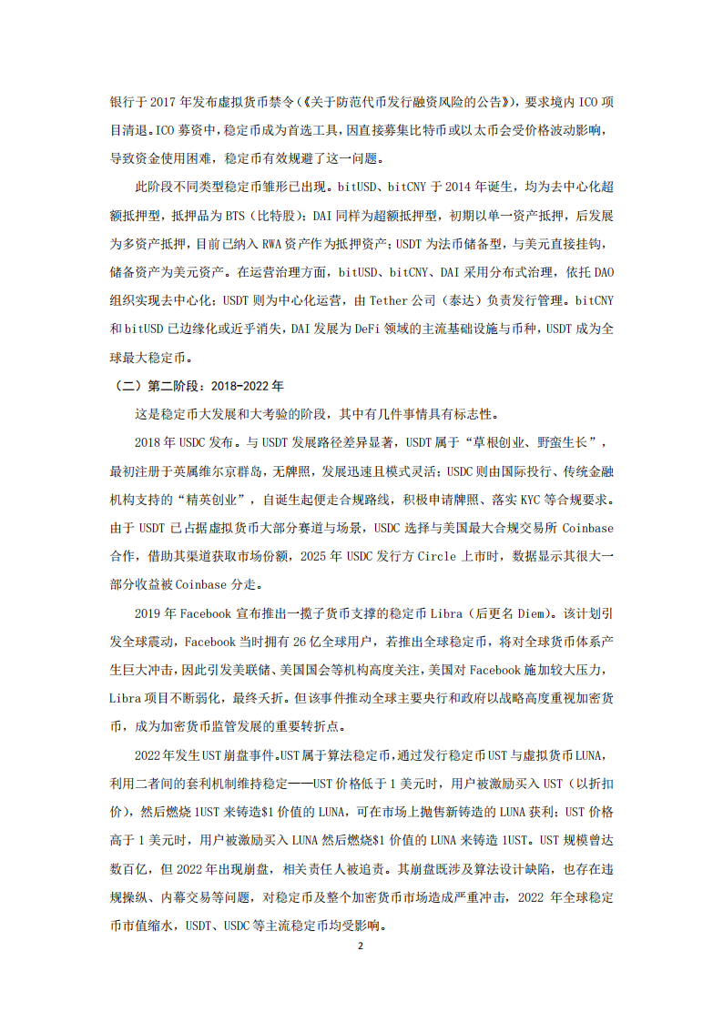 此阶段不同类型稳定币雏形已出现。bitUSD、bitCNY于2014年诞生,均为去中心化超额抵押型,抵押品为BTS(比特股);DAI同样为超额抵押型,初期以单一资产抵押,后发展为多资产抵押,目前已纳入RWA资产作为抵押资产;USDT为法币储备型,与美元直接挂钩,储备资产为美元资产。在运营治理方面,bitUSD、bitCNY、DAI采用分布式治理,依托DAO组织实现去中心化;USDT则为中心化运营,由Tether公司(泰达)负责发行管理。bitCNY和bitUSD已边缘化或近乎消失,DAI发展为DeFi领域的主流基础设施与币种,USDT成为全球最大稳定币。