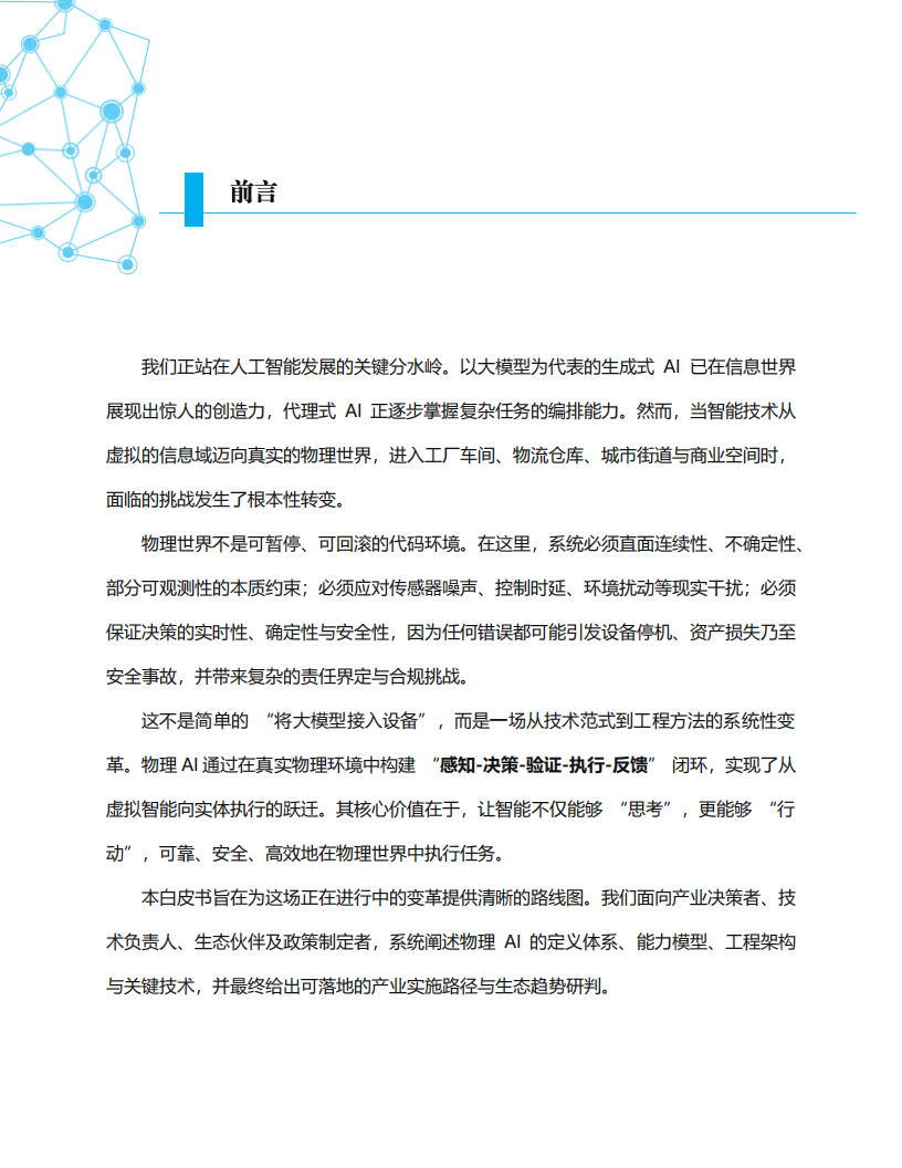本白皮书旨在为这场正在进行中的变革提供清晰的路线图。我们面向产业决策者、技术负责人、生态伙伴及政策制定者,系统阐述物理Al的定义体系、能力模型、工程架构与关键技术,并最终给出可落地的产业实施路径与生态趋势研判。